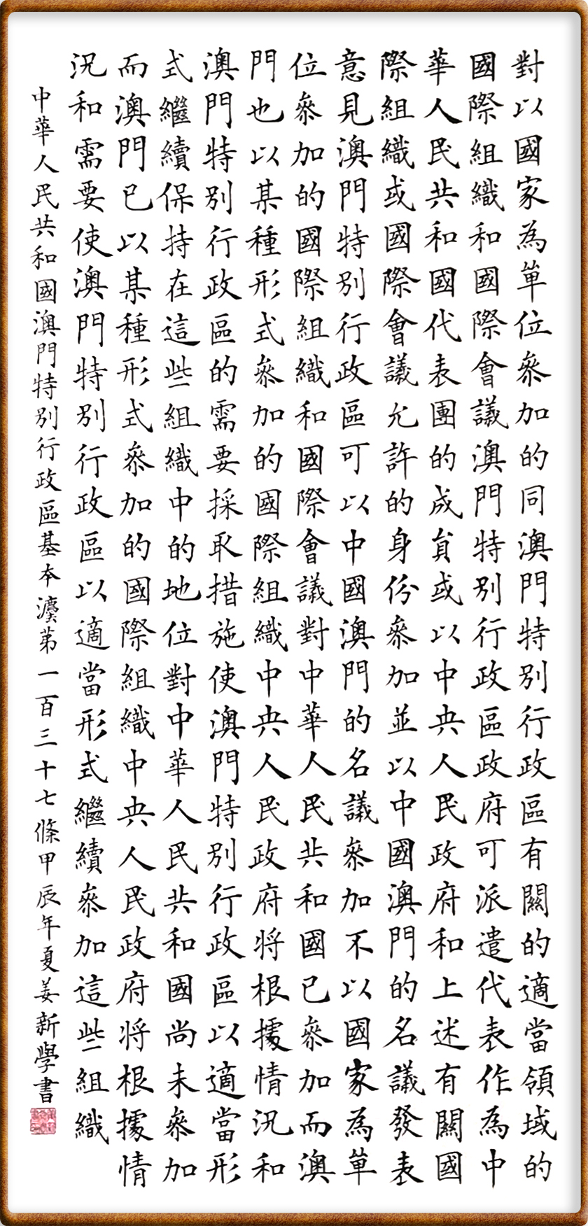 澳門基本法第一百三十七條 對以國家為單位參加的、同澳門特別行政區(qū)有關(guān)的、適當領(lǐng)域的國際組織和國際會議,澳門特別行政區(qū)政府可派遣代表作為中華人民共和國代表團的成員或以中央人民政府和上述有關(guān)國際組織或國際會議允許的身份參加,并以“中國澳門”的名義發(fā)表意見。