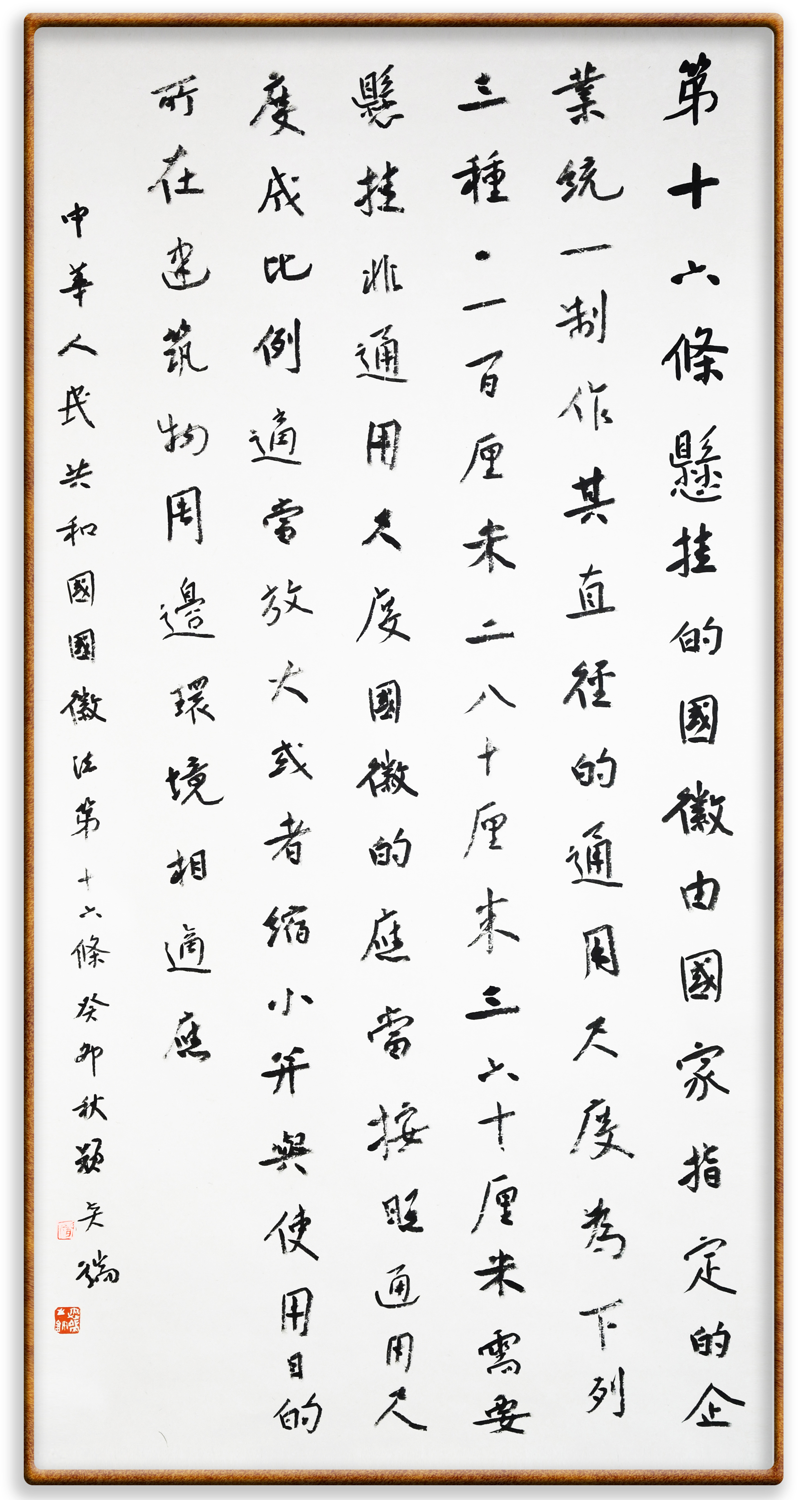 需要懸掛非通用尺度國徽的,應當按照通用尺度成比例適當放大或者縮小,并與使用目的、所在建筑物、周邊環(huán)境相適應。