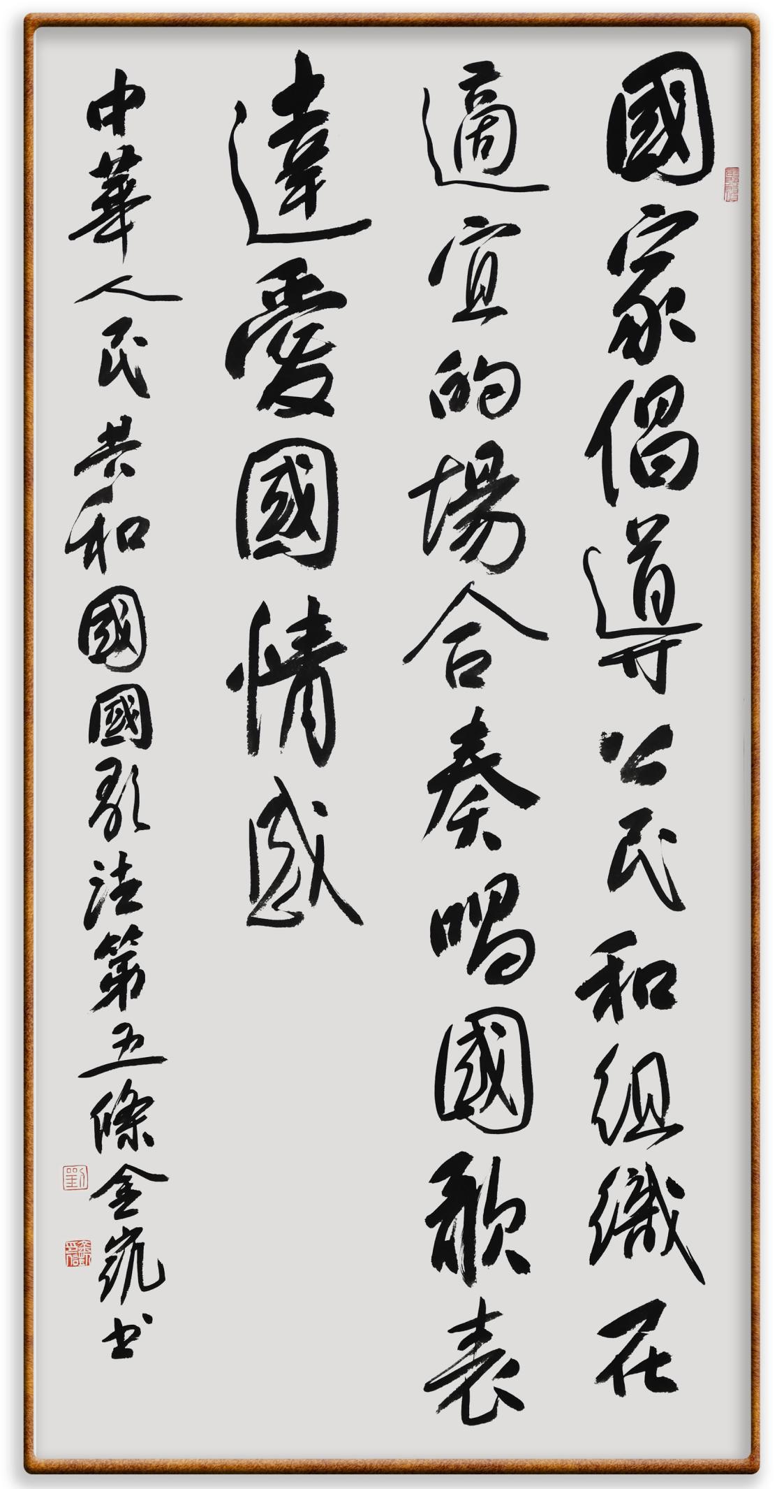 國歌法第五條 國家倡導公民和組織在適宜的場合奏唱國歌,表達愛國情感。