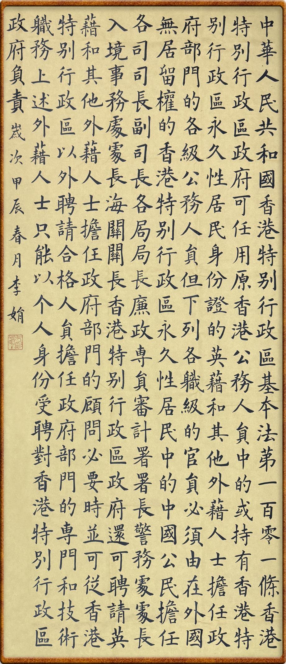 香港基本法第一百零一條 香港特別行政區(qū)政府可任用原香港公務(wù)人員中的或持有香港特別行政區(qū)永久性居民身份證的英籍和其他外籍人士擔(dān)任政府部門的各級公務(wù)人員,但下列各職級的官員必須由在外國無居留權(quán)的香港特別行政區(qū)永久性居民中的中國公民擔(dān)任:各司司長、副司長,各局局長,廉政專員,審計署署長,警務(wù)處處長,入境事務(wù)處處長,海關(guān)關(guān)長。