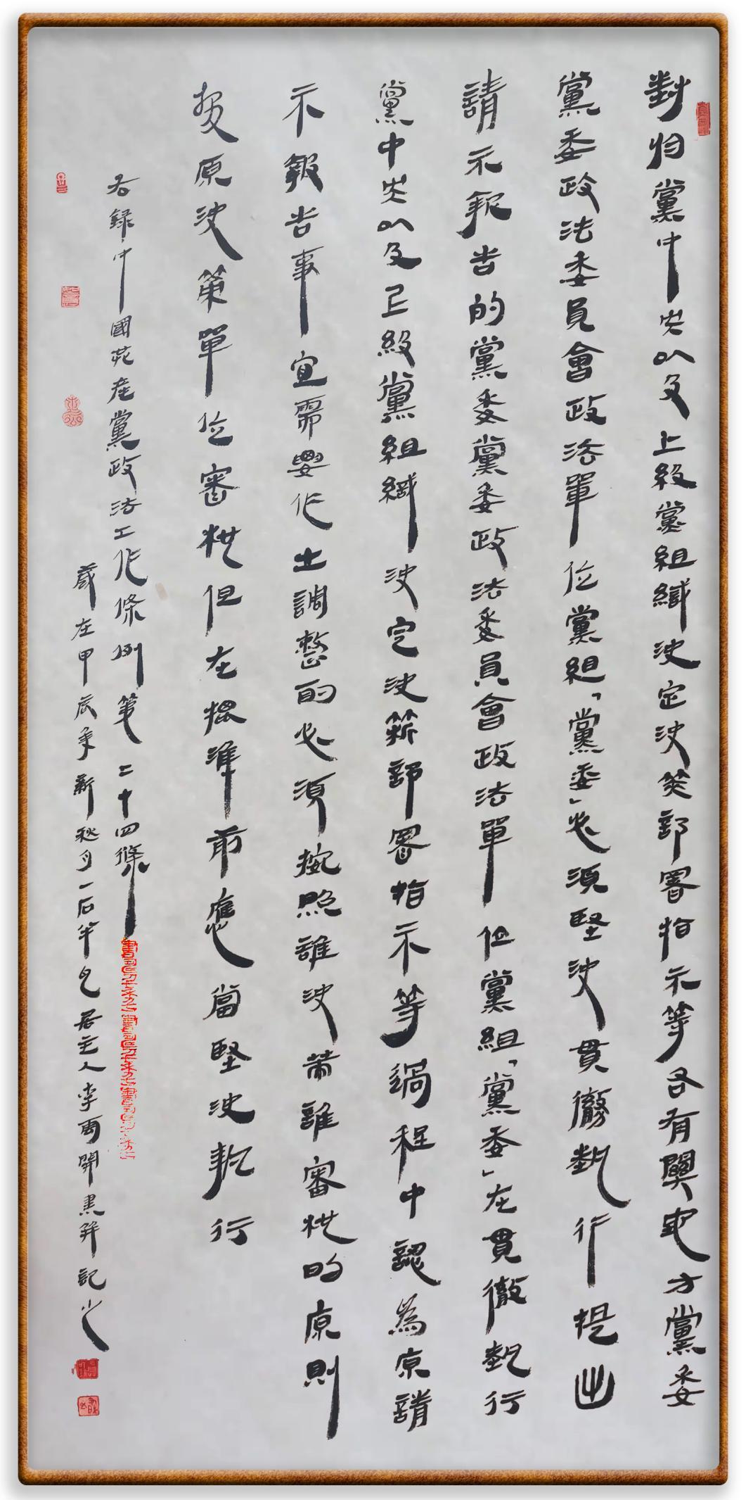 《中國共產黨政法工作條例》對黨領導新時代政法工作進行全面制度擘畫,為黨領導政法工作提供基本遵循,具有重大而深遠的意義。為學習好、宣傳好、貫徹好、實施好這部黨內法規(guī),繼《中華人民共和國民法典》《中華人民共和國憲法》《信訪工作條例》《中華人民共和國澳門特別行政區(qū)基本法》《中華人民共和國香港特別行政區(qū)基本法》等法律法規(guī)之后,“書·法”系列活動將筆端對準《中國共產黨政法工作條例》。