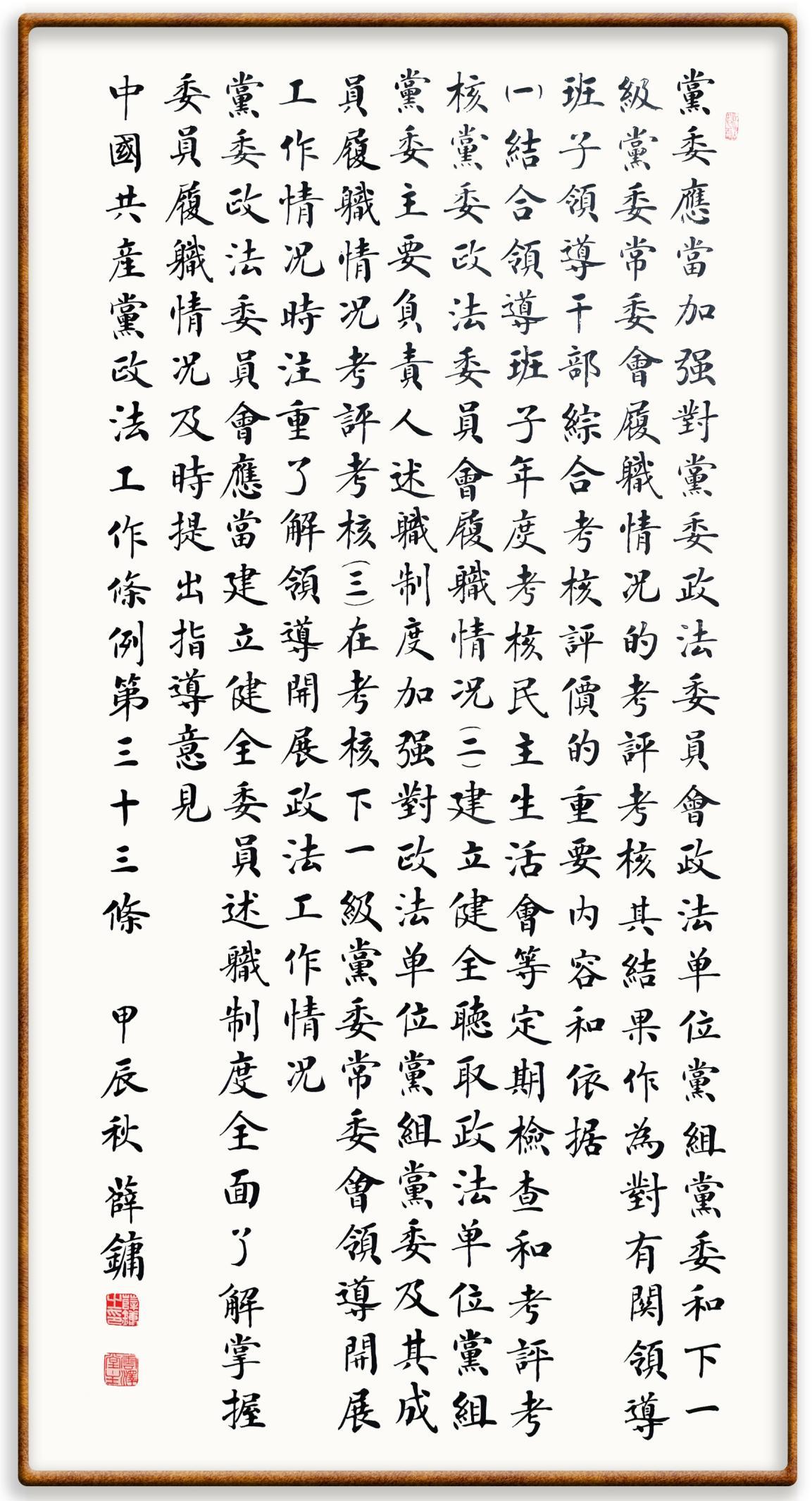 《中國共產(chǎn)黨政法工作條例》對黨領(lǐng)導(dǎo)新時代政法工作進(jìn)行全面制度擘畫,為黨領(lǐng)導(dǎo)政法工作提供基本遵循,具有重大而深遠(yuǎn)的意義。為學(xué)習(xí)好、宣傳好、貫徹好、實(shí)施好這部黨內(nèi)法規(guī),繼《中華人民共和國民法典》《中華人民共和國憲法》《信訪工作條例》《中華人民共和國澳門特別行政區(qū)基本法》《中華人民共和國香港特別行政區(qū)基本法》等法律法規(guī)之后,“書·法”系列活動將筆端對準(zhǔn)《中國共產(chǎn)黨政法工作條例》。