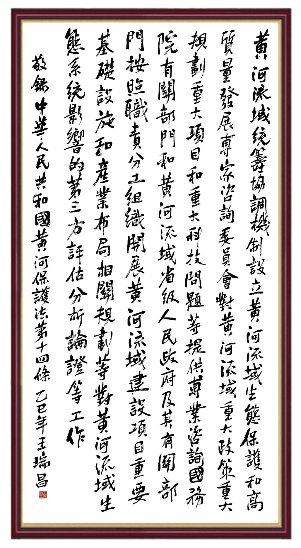 黃河寧,天下平。黃河是中華民族的發(fā)源地和搖籃,保護黃河是事關(guān)中華民族偉大復興的千秋大計。《中華人民共和國黃河保護法》為推進水資源節(jié)約集約利用、保護傳承弘揚黃河文化、推動黃河流域生態(tài)保護和高質(zhì)量發(fā)展提供了有力法治保障。繼書寫《中華人民共和國民法典》《中華人民共和國憲法》《中華人民共和國澳門特別行政區(qū)基本法》《中華人民共和國香港特別行政區(qū)基本法》《中華人民共和國國旗法》《中華人民共和國國徽法》《中華人民共和國國歌法》《中華人民共和國法官法》等法律法規(guī)之后,法制日報社聯(lián)合沿黃九?。▍^(qū))司法廳、書法家協(xié)會,將筆端對準《中華人民共和國黃河保護法》。