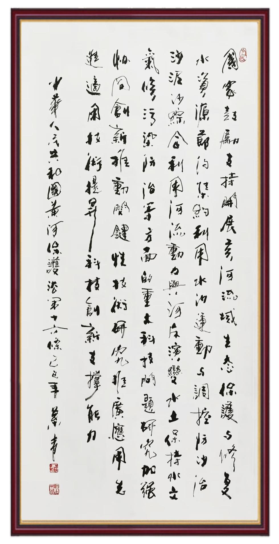 黃河寧,天下平。黃河是中華民族的發(fā)源地和搖籃,保護(hù)黃河是事關(guān)中華民族偉大復(fù)興的千秋大計(jì)?!吨腥A人民共和國(guó)黃河保護(hù)法》為推進(jìn)水資源節(jié)約集約利用、保護(hù)傳承弘揚(yáng)黃河文化、推動(dòng)黃河流域生態(tài)保護(hù)和高質(zhì)量發(fā)展提供了有力法治保障。繼書(shū)寫(xiě)《中華人民共和國(guó)民法典》《中華人民共和國(guó)憲法》《中華人民共和國(guó)澳門(mén)特別行政區(qū)基本法》《中華人民共和國(guó)香港特別行政區(qū)基本法》《中華人民共和國(guó)國(guó)旗法》《中華人民共和國(guó)國(guó)徽法》《中華人民共和國(guó)國(guó)歌法》《中華人民共和國(guó)法官法》等法律法規(guī)之后,法制日?qǐng)?bào)社聯(lián)合沿黃九?。▍^(qū))司法廳、書(shū)法家協(xié)會(huì),將筆端對(duì)準(zhǔn)《中華人民共和國(guó)黃河保護(hù)法》。