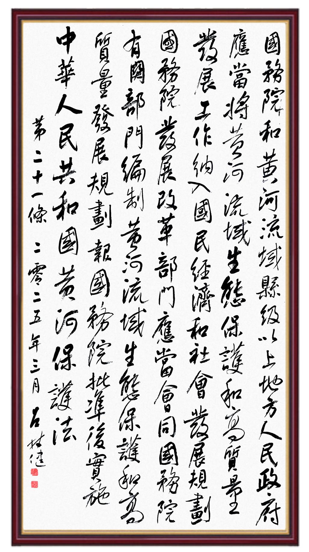黃河寧,天下平。黃河是中華民族的發(fā)源地和搖籃,保護黃河是事關中華民族偉大復興的千秋大計。《中華人民共和國黃河保護法》為推進水資源節(jié)約集約利用、保護傳承弘揚黃河文化、推動黃河流域生態(tài)保護和高質量發(fā)展提供了有力法治保障。繼書寫《中華人民共和國民法典》《中華人民共和國憲法》《中華人民共和國澳門特別行政區(qū)基本法》《中華人民共和國香港特別行政區(qū)基本法》《中華人民共和國國旗法》《中華人民共和國國徽法》《中華人民共和國國歌法》《中華人民共和國法官法》等法律法規(guī)之后,法制日報社聯(lián)合沿黃九?。▍^(qū))司法廳、書法家協(xié)會,將筆端對準《中華人民共和國黃河保護法》。