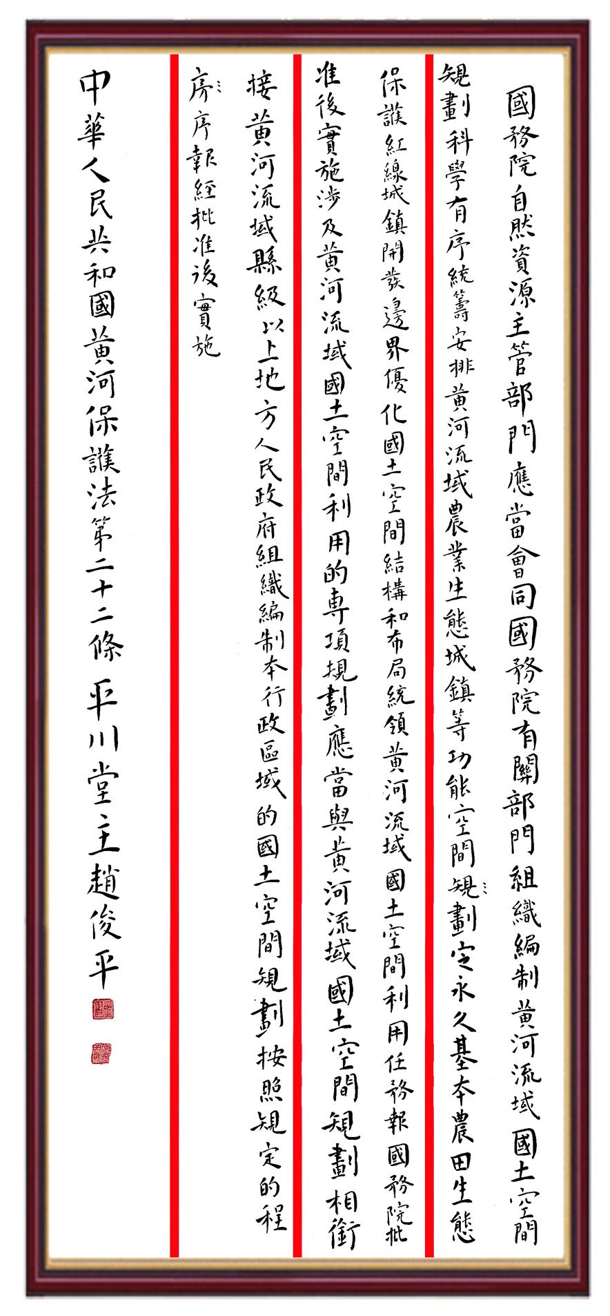 黃河寧,天下平。黃河是中華民族的發(fā)源地和搖籃,保護(hù)黃河是事關(guān)中華民族偉大復(fù)興的千秋大計(jì)?!吨腥A人民共和國黃河保護(hù)法》為推進(jìn)水資源節(jié)約集約利用、保護(hù)傳承弘揚(yáng)黃河文化、推動(dòng)黃河流域生態(tài)保護(hù)和高質(zhì)量發(fā)展提供了有力法治保障。繼書寫《中華人民共和國民法典》《中華人民共和國憲法》《中華人民共和國澳門特別行政區(qū)基本法》《中華人民共和國香港特別行政區(qū)基本法》《中華人民共和國國旗法》《中華人民共和國國徽法》《中華人民共和國國歌法》《中華人民共和國法官法》等法律法規(guī)之后,法制日?qǐng)?bào)社聯(lián)合沿黃九?。▍^(qū))司法廳、書法家協(xié)會(huì),將筆端對(duì)準(zhǔn)《中華人民共和國黃河保護(hù)法》。