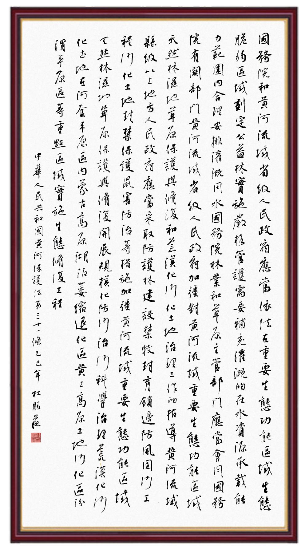 黃河寧,天下平。黃河是中華民族的發(fā)源地和搖籃,保護黃河是事關(guān)中華民族偉大復(fù)興的千秋大計。《中華人民共和國黃河保護法》為推進水資源節(jié)約集約利用、保護傳承弘揚黃河文化、推動黃河流域生態(tài)保護和高質(zhì)量發(fā)展提供了有力法治保障。繼書寫《中華人民共和國民法典》《中華人民共和國憲法》《中華人民共和國澳門特別行政區(qū)基本法》《中華人民共和國香港特別行政區(qū)基本法》《中華人民共和國國旗法》《中華人民共和國國徽法》《中華人民共和國國歌法》《中華人民共和國法官法》等法律法規(guī)之后,法制日報社聯(lián)合沿黃九?。▍^(qū))司法廳、書法家協(xié)會,將筆端對準(zhǔn)《中華人民共和國黃河保護法》。