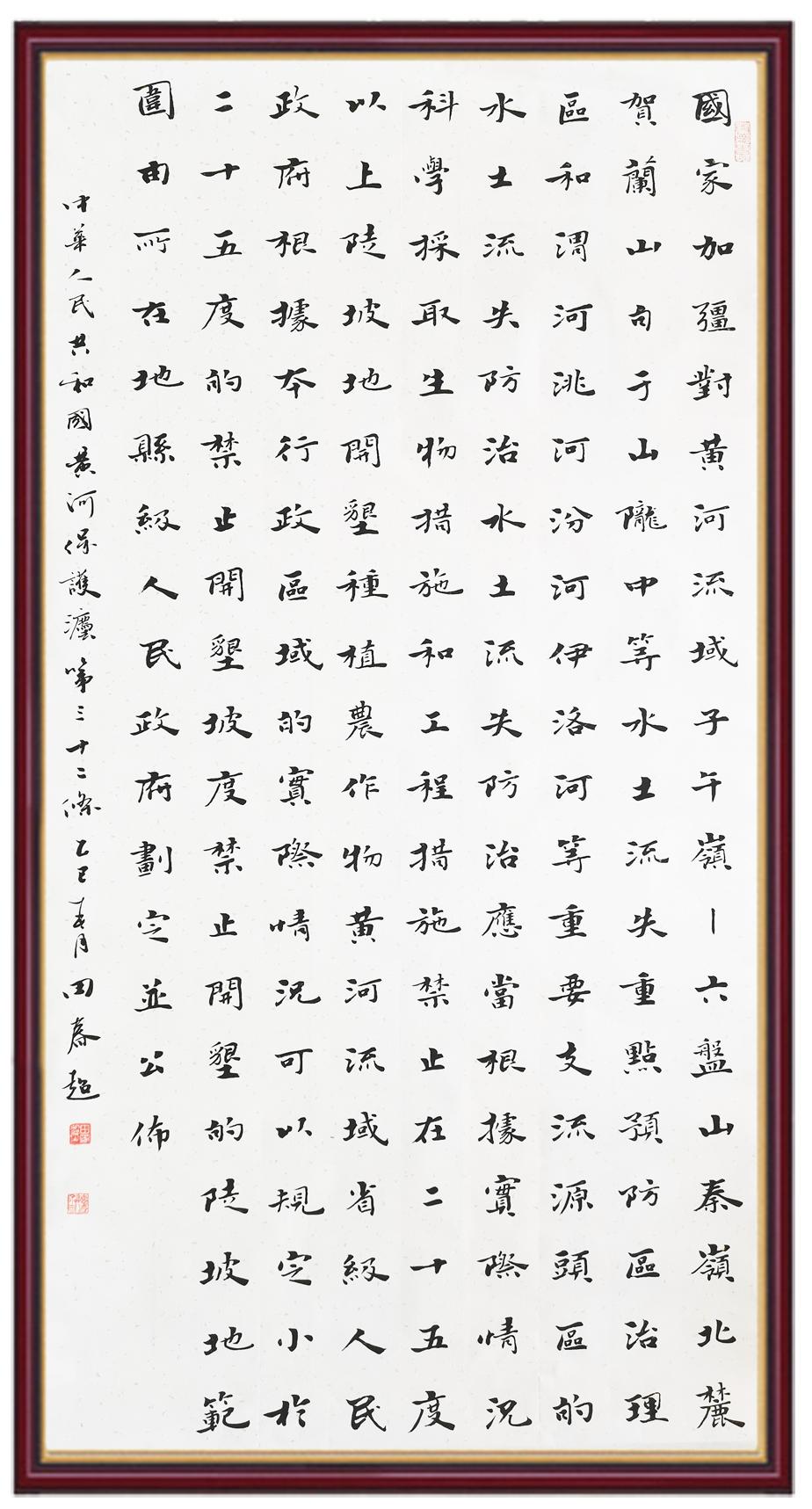 黃河寧,天下平。黃河是中華民族的發(fā)源地和搖籃,保護黃河是事關(guān)中華民族偉大復(fù)興的千秋大計。《中華人民共和國黃河保護法》為推進水資源節(jié)約集約利用、保護傳承弘揚黃河文化、推動黃河流域生態(tài)保護和高質(zhì)量發(fā)展提供了有力法治保障。繼書寫《中華人民共和國民法典》《中華人民共和國憲法》《中華人民共和國澳門特別行政區(qū)基本法》《中華人民共和國香港特別行政區(qū)基本法》《中華人民共和國國旗法》《中華人民共和國國徽法》《中華人民共和國國歌法》《中華人民共和國法官法》等法律法規(guī)之后,法制日報社聯(lián)合沿黃九?。▍^(qū))司法廳、書法家協(xié)會,將筆端對準(zhǔn)《中華人民共和國黃河保護法》。