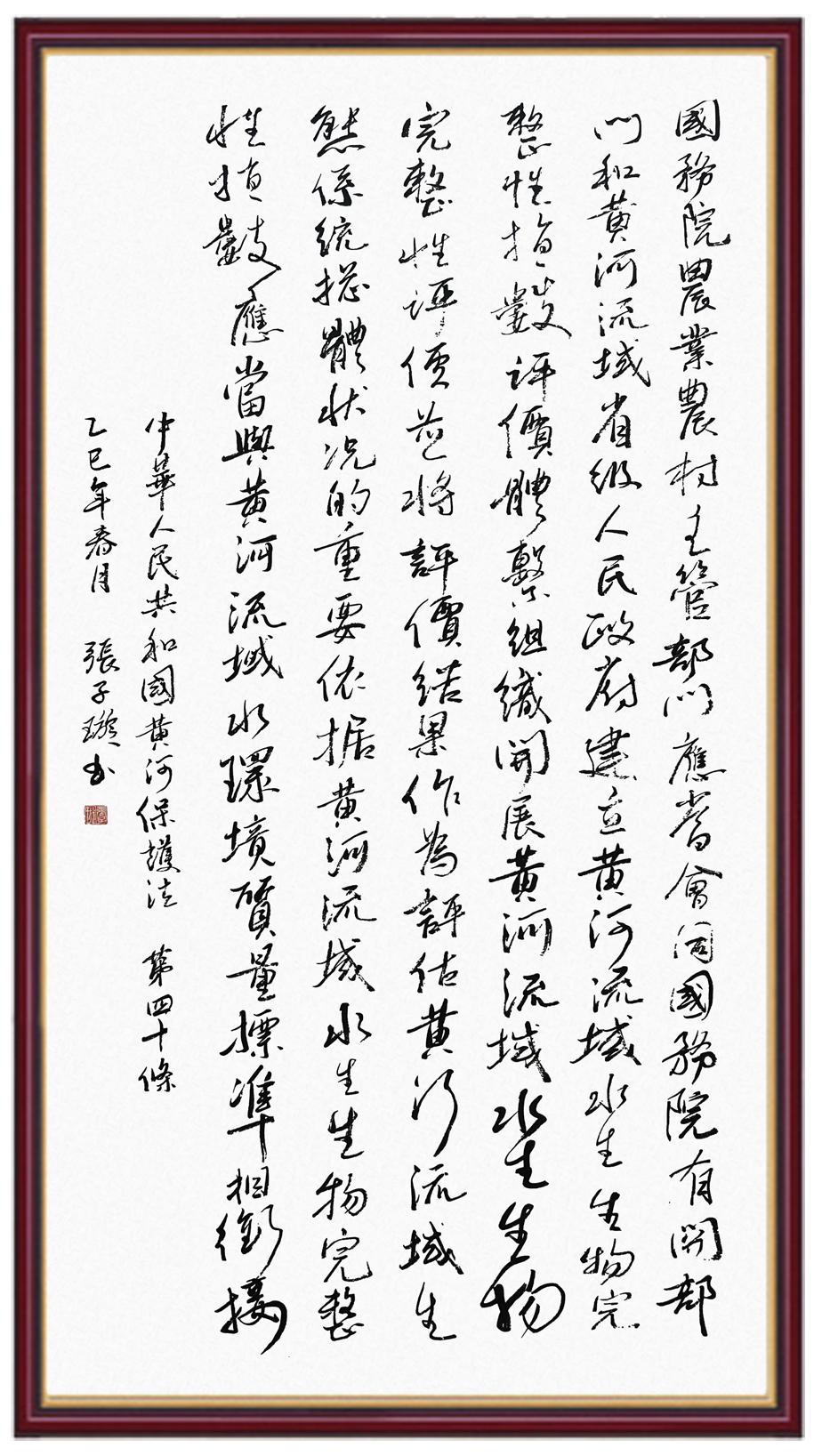 黃河寧,天下平。黃河是中華民族的發(fā)源地和搖籃,保護(hù)黃河是事關(guān)中華民族偉大復(fù)興的千秋大計(jì)?!吨腥A人民共和國(guó)黃河保護(hù)法》為推進(jìn)水資源節(jié)約集約利用、保護(hù)傳承弘揚(yáng)黃河文化、推動(dòng)黃河流域生態(tài)保護(hù)和高質(zhì)量發(fā)展提供了有力法治保障。繼書(shū)寫(xiě)《中華人民共和國(guó)民法典》《中華人民共和國(guó)憲法》《中華人民共和國(guó)澳門(mén)特別行政區(qū)基本法》《中華人民共和國(guó)香港特別行政區(qū)基本法》《中華人民共和國(guó)國(guó)旗法》《中華人民共和國(guó)國(guó)徽法》《中華人民共和國(guó)國(guó)歌法》《中華人民共和國(guó)法官法》等法律法規(guī)之后,法制日?qǐng)?bào)社聯(lián)合沿黃九?。▍^(qū))司法廳、書(shū)法家協(xié)會(huì),將筆端對(duì)準(zhǔn)《中華人民共和國(guó)黃河保護(hù)法》。