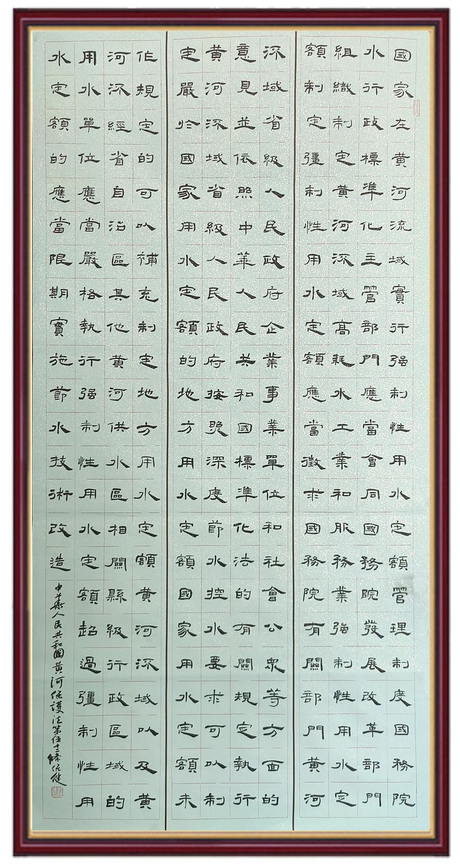 黃河寧,天下平。黃河是中華民族的發(fā)源地和搖籃,保護黃河是事關(guān)中華民族偉大復(fù)興的千秋大計。《中華人民共和國黃河保護法》為推進水資源節(jié)約集約利用、保護傳承弘揚黃河文化、推動黃河流域生態(tài)保護和高質(zhì)量發(fā)展提供了有力法治保障。繼書寫《中華人民共和國民法典》《中華人民共和國憲法》《中華人民共和國澳門特別行政區(qū)基本法》《中華人民共和國香港特別行政區(qū)基本法》《中華人民共和國國旗法》《中華人民共和國國徽法》《中華人民共和國國歌法》《中華人民共和國法官法》等法律法規(guī)之后,法制日報社聯(lián)合沿黃九?。▍^(qū))司法廳、書法家協(xié)會,將筆端對準《中華人民共和國黃河保護法》。