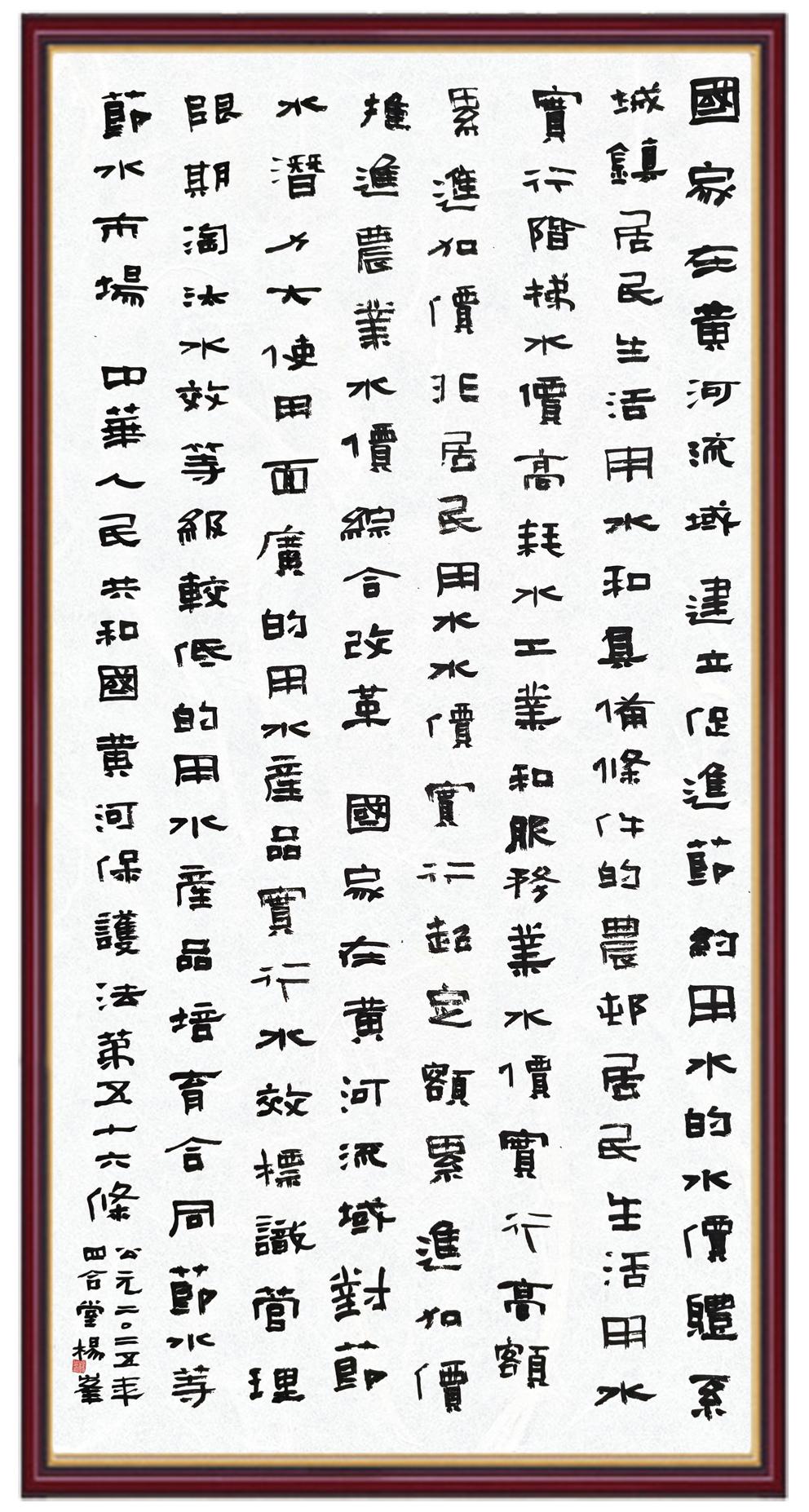 黃河寧,天下平。黃河是中華民族的發(fā)源地和搖籃,保護黃河是事關中華民族偉大復興的千秋大計。《中華人民共和國黃河保護法》為推進水資源節(jié)約集約利用、保護傳承弘揚黃河文化、推動黃河流域生態(tài)保護和高質量發(fā)展提供了有力法治保障。繼書寫《中華人民共和國民法典》《中華人民共和國憲法》《中華人民共和國澳門特別行政區(qū)基本法》《中華人民共和國香港特別行政區(qū)基本法》《中華人民共和國國旗法》《中華人民共和國國徽法》《中華人民共和國國歌法》《中華人民共和國法官法》等法律法規(guī)之后,法制日報社聯(lián)合沿黃九?。▍^(qū))司法廳、書法家協(xié)會,將筆端對準《中華人民共和國黃河保護法》。