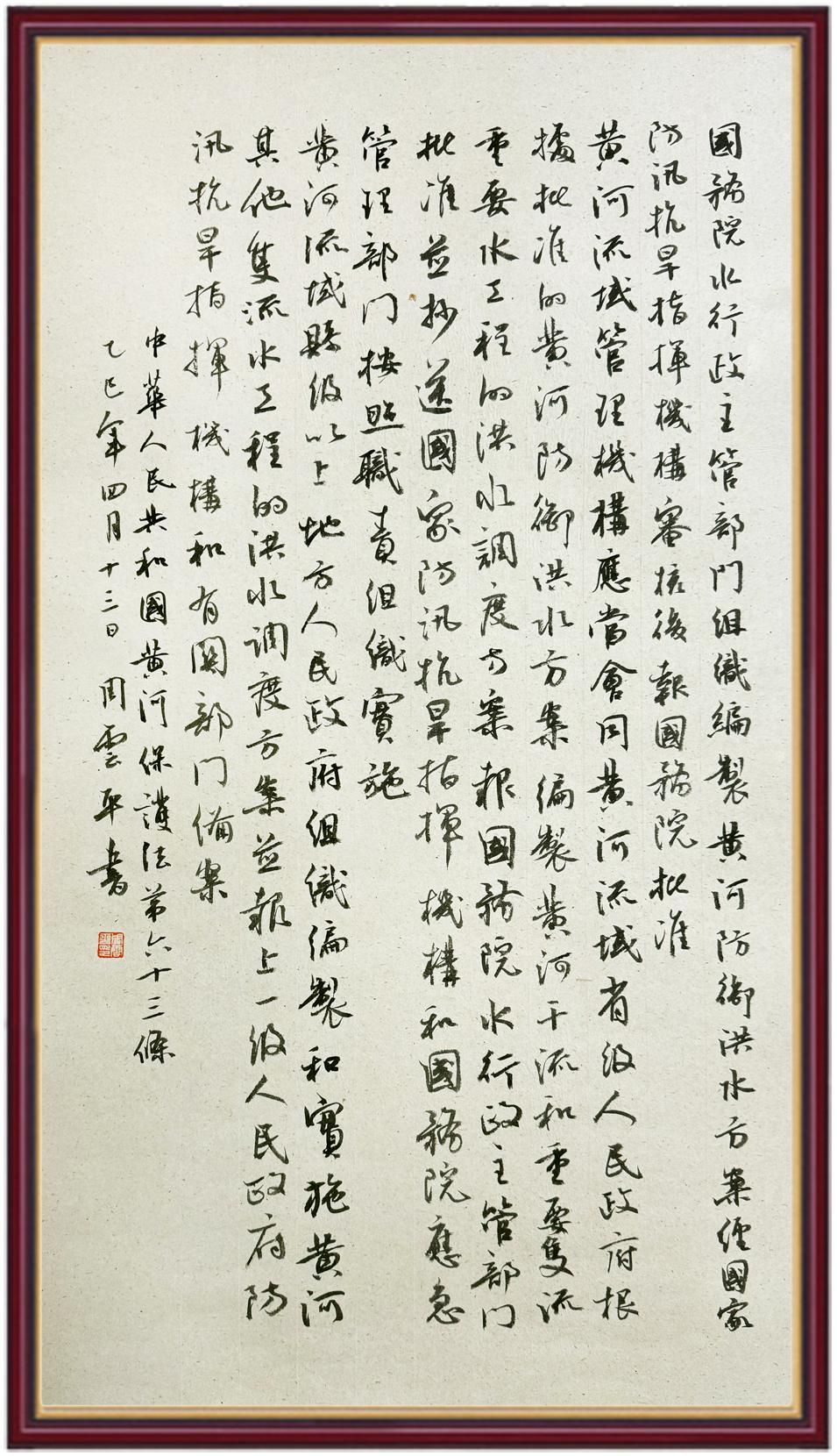 黃河寧,天下平。黃河是中華民族的發(fā)源地和搖籃,保護黃河是事關(guān)中華民族偉大復(fù)興的千秋大計?!吨腥A人民共和國黃河保護法》為推進水資源節(jié)約集約利用、保護傳承弘揚黃河文化、推動黃河流域生態(tài)保護和高質(zhì)量發(fā)展提供了有力法治保障。繼書寫《中華人民共和國民法典》《中華人民共和國憲法》《中華人民共和國澳門特別行政區(qū)基本法》《中華人民共和國香港特別行政區(qū)基本法》《中華人民共和國國旗法》《中華人民共和國國徽法》《中華人民共和國國歌法》《中華人民共和國法官法》等法律法規(guī)之后,法制日報社聯(lián)合沿黃九省(區(qū))司法廳、書法家協(xié)會,將筆端對準《中華人民共和國黃河保護法》。