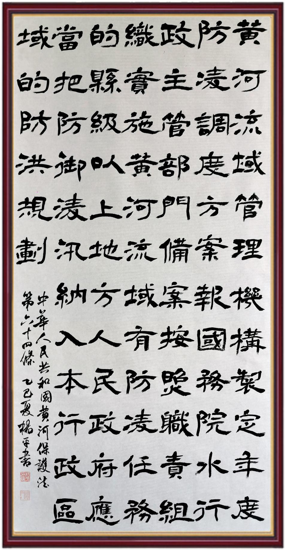 黃河寧,天下平。黃河是中華民族的發(fā)源地和搖籃,保護(hù)黃河是事關(guān)中華民族偉大復(fù)興的千秋大計(jì)?!吨腥A人民共和國黃河保護(hù)法》為推進(jìn)水資源節(jié)約集約利用、保護(hù)傳承弘揚(yáng)黃河文化、推動(dòng)黃河流域生態(tài)保護(hù)和高質(zhì)量發(fā)展提供了有力法治保障。繼書寫《中華人民共和國民法典》《中華人民共和國憲法》《中華人民共和國澳門特別行政區(qū)基本法》《中華人民共和國香港特別行政區(qū)基本法》《中華人民共和國國旗法》《中華人民共和國國徽法》《中華人民共和國國歌法》《中華人民共和國法官法》等法律法規(guī)之后,法制日報(bào)社聯(lián)合沿黃九?。▍^(qū))司法廳、書法家協(xié)會(huì),將筆端對準(zhǔn)《中華人民共和國黃河保護(hù)法》。