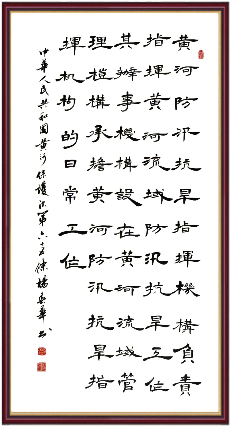 黃河寧,天下平。黃河是中華民族的發(fā)源地和搖籃,保護(hù)黃河是事關(guān)中華民族偉大復(fù)興的千秋大計(jì)?!吨腥A人民共和國黃河保護(hù)法》為推進(jìn)水資源節(jié)約集約利用、保護(hù)傳承弘揚(yáng)黃河文化、推動黃河流域生態(tài)保護(hù)和高質(zhì)量發(fā)展提供了有力法治保障。繼書寫《中華人民共和國民法典》《中華人民共和國憲法》《中華人民共和國澳門特別行政區(qū)基本法》《中華人民共和國香港特別行政區(qū)基本法》《中華人民共和國國旗法》《中華人民共和國國徽法》《中華人民共和國國歌法》《中華人民共和國法官法》等法律法規(guī)之后,法制日報(bào)社聯(lián)合沿黃九?。▍^(qū))司法廳、書法家協(xié)會,將筆端對準(zhǔn)《中華人民共和國黃河保護(hù)法》。