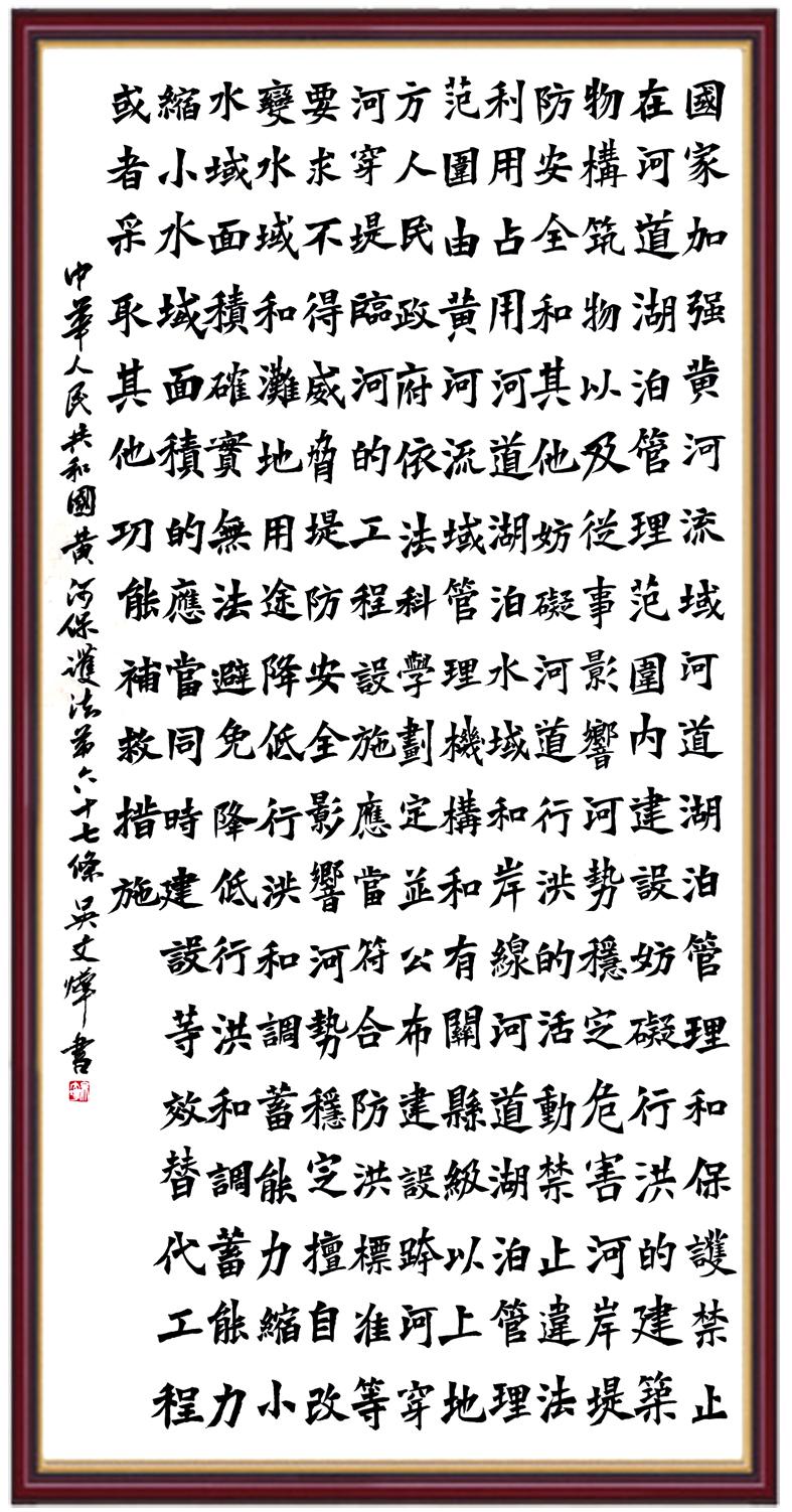 黃河寧,天下平。黃河是中華民族的發(fā)源地和搖籃,保護黃河是事關(guān)中華民族偉大復(fù)興的千秋大計?!吨腥A人民共和國黃河保護法》為推進水資源節(jié)約集約利用、保護傳承弘揚黃河文化、推動黃河流域生態(tài)保護和高質(zhì)量發(fā)展提供了有力法治保障。繼書寫《中華人民共和國民法典》《中華人民共和國憲法》《中華人民共和國澳門特別行政區(qū)基本法》《中華人民共和國香港特別行政區(qū)基本法》《中華人民共和國國旗法》《中華人民共和國國徽法》《中華人民共和國國歌法》《中華人民共和國法官法》等法律法規(guī)之后,法制日報社聯(lián)合沿黃九?。▍^(qū))司法廳、書法家協(xié)會,將筆端對準《中華人民共和國黃河保護法》。