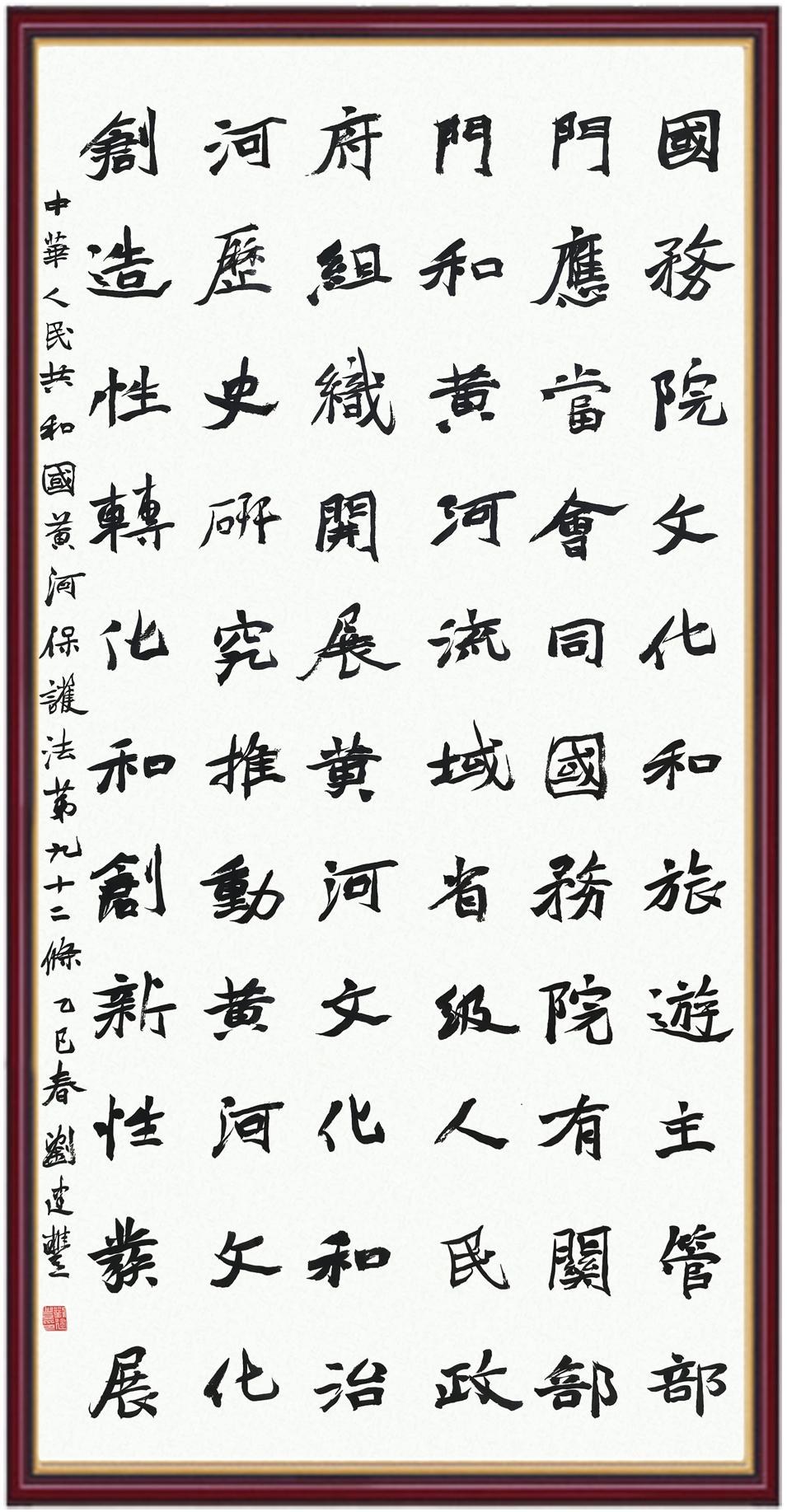 黃河寧,天下平。黃河是中華民族的發(fā)源地和搖籃,保護黃河是事關中華民族偉大復興的千秋大計。《中華人民共和國黃河保護法》為推進水資源節(jié)約集約利用、保護傳承弘揚黃河文化、推動黃河流域生態(tài)保護和高質量發(fā)展提供了有力法治保障。繼書寫《中華人民共和國民法典》《中華人民共和國憲法》《中華人民共和國澳門特別行政區(qū)基本法》《中華人民共和國香港特別行政區(qū)基本法》《中華人民共和國國旗法》《中華人民共和國國徽法》《中華人民共和國國歌法》《中華人民共和國法官法》等法律法規(guī)之后,法制日報社聯(lián)合沿黃九?。▍^(qū))司法廳、書法家協(xié)會,將筆端對準《中華人民共和國黃河保護法》。