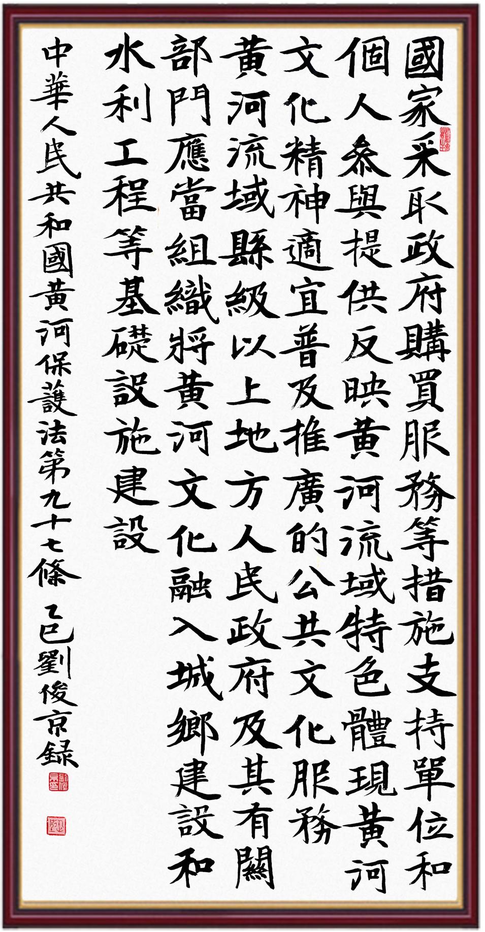 黃河寧,天下平。黃河是中華民族的發(fā)源地和搖籃,保護(hù)黃河是事關(guān)中華民族偉大復(fù)興的千秋大計(jì)?!吨腥A人民共和國(guó)黃河保護(hù)法》為推進(jìn)水資源節(jié)約集約利用、保護(hù)傳承弘揚(yáng)黃河文化、推動(dòng)黃河流域生態(tài)保護(hù)和高質(zhì)量發(fā)展提供了有力法治保障。繼書寫《中華人民共和國(guó)民法典》《中華人民共和國(guó)憲法》《中華人民共和國(guó)澳門特別行政區(qū)基本法》《中華人民共和國(guó)香港特別行政區(qū)基本法》《中華人民共和國(guó)國(guó)旗法》《中華人民共和國(guó)國(guó)徽法》《中華人民共和國(guó)國(guó)歌法》《中華人民共和國(guó)法官法》等法律法規(guī)之后,法制日?qǐng)?bào)社聯(lián)合沿黃九?。▍^(qū))司法廳、書法家協(xié)會(huì),將筆端對(duì)準(zhǔn)《中華人民共和國(guó)黃河保護(hù)法》。