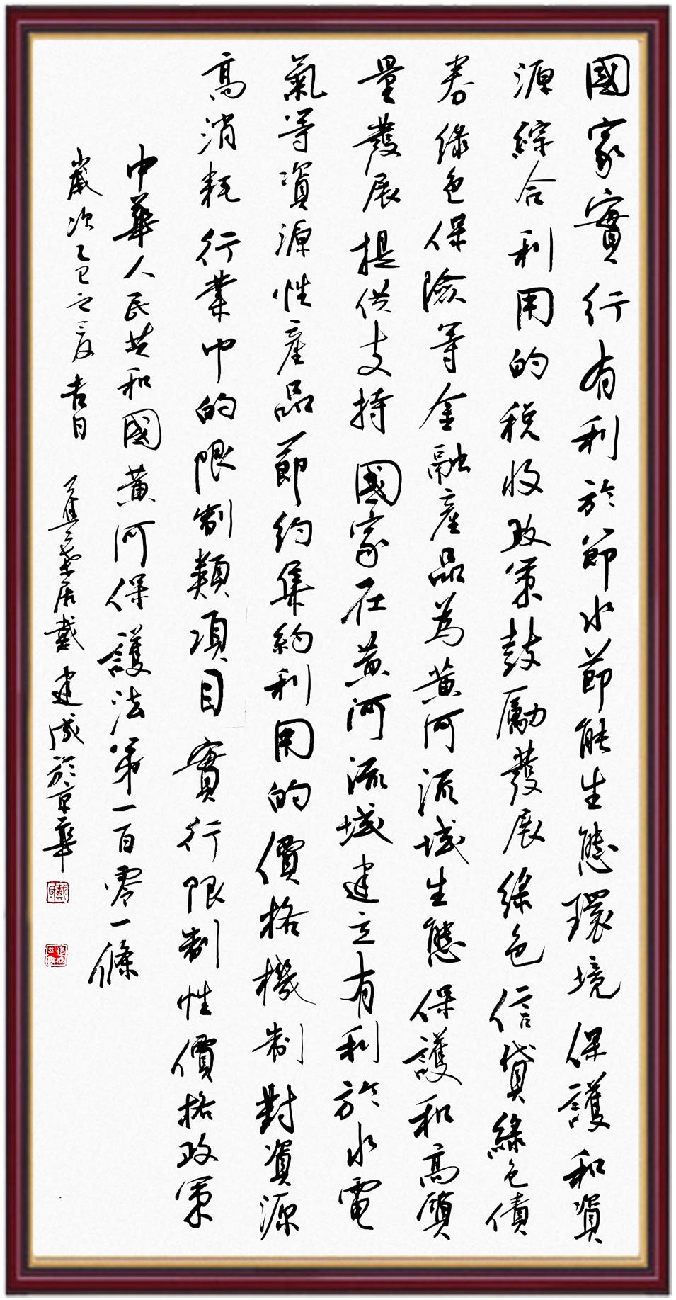 黃河寧,天下平。黃河是中華民族的發(fā)源地和搖籃,保護黃河是事關(guān)中華民族偉大復(fù)興的千秋大計?!吨腥A人民共和國黃河保護法》為推進水資源節(jié)約集約利用、保護傳承弘揚黃河文化、推動黃河流域生態(tài)保護和高質(zhì)量發(fā)展提供了有力法治保障。繼書寫《中華人民共和國民法典》《中華人民共和國憲法》《中華人民共和國澳門特別行政區(qū)基本法》《中華人民共和國香港特別行政區(qū)基本法》《中華人民共和國國旗法》《中華人民共和國國徽法》《中華人民共和國國歌法》《中華人民共和國法官法》等法律法規(guī)之后,法制日報社聯(lián)合沿黃九省(區(qū))司法廳、書法家協(xié)會,將筆端對準《中華人民共和國黃河保護法》。