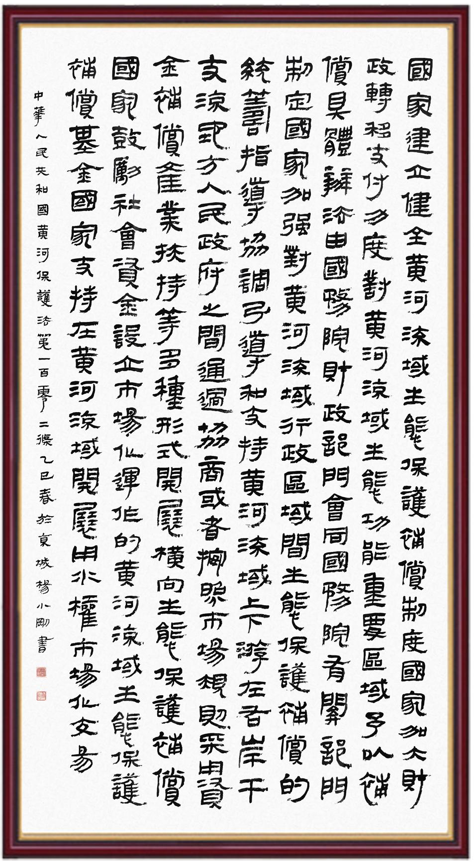 黃河寧,天下平。黃河是中華民族的發(fā)源地和搖籃,保護(hù)黃河是事關(guān)中華民族偉大復(fù)興的千秋大計(jì)?!吨腥A人民共和國(guó)黃河保護(hù)法》為推進(jìn)水資源節(jié)約集約利用、保護(hù)傳承弘揚(yáng)黃河文化、推動(dòng)黃河流域生態(tài)保護(hù)和高質(zhì)量發(fā)展提供了有力法治保障。繼書寫《中華人民共和國(guó)民法典》《中華人民共和國(guó)憲法》《中華人民共和國(guó)澳門特別行政區(qū)基本法》《中華人民共和國(guó)香港特別行政區(qū)基本法》《中華人民共和國(guó)國(guó)旗法》《中華人民共和國(guó)國(guó)徽法》《中華人民共和國(guó)國(guó)歌法》《中華人民共和國(guó)法官法》等法律法規(guī)之后,法制日?qǐng)?bào)社聯(lián)合沿黃九?。▍^(qū))司法廳、書法家協(xié)會(huì),將筆端對(duì)準(zhǔn)《中華人民共和國(guó)黃河保護(hù)法》。