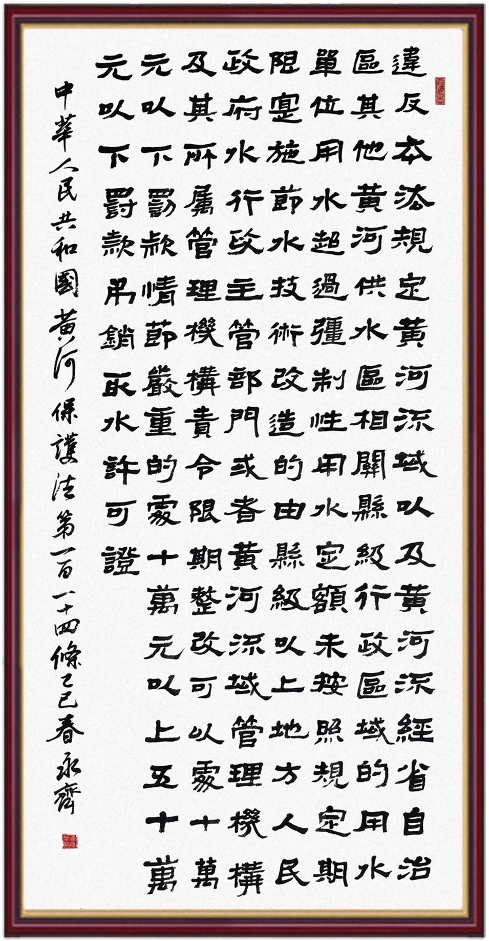 黃河寧,天下平。黃河是中華民族的發(fā)源地和搖籃,保護黃河是事關(guān)中華民族偉大復(fù)興的千秋大計。《中華人民共和國黃河保護法》為推進水資源節(jié)約集約利用、保護傳承弘揚黃河文化、推動黃河流域生態(tài)保護和高質(zhì)量發(fā)展提供了有力法治保障。繼書寫《中華人民共和國民法典》《中華人民共和國憲法》《中華人民共和國澳門特別行政區(qū)基本法》《中華人民共和國香港特別行政區(qū)基本法》《中華人民共和國國旗法》《中華人民共和國國徽法》《中華人民共和國國歌法》《中華人民共和國法官法》等法律法規(guī)之后,法制日報社聯(lián)合沿黃九?。▍^(qū))司法廳、書法家協(xié)會,將筆端對準《中華人民共和國黃河保護法》。