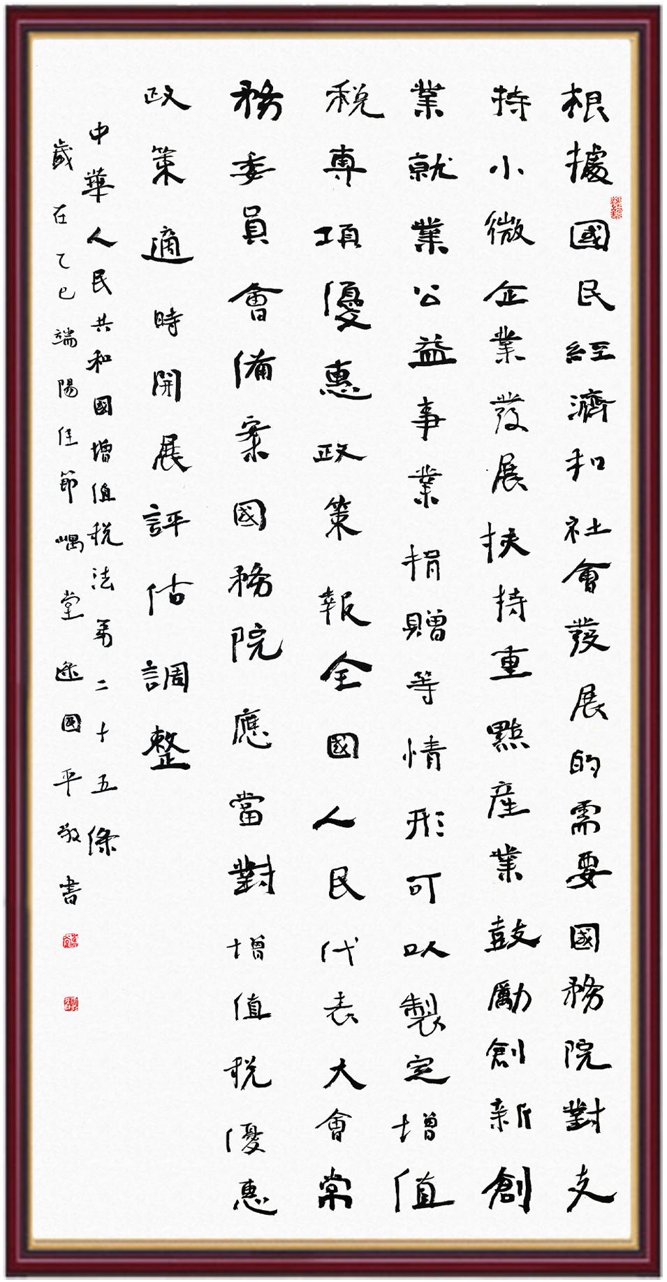 稅收一頭連著國(guó)計(jì),一頭連著民生。全面推進(jìn)依法治稅,是全面依法治國(guó)基本方略在稅收領(lǐng)域的集中體現(xiàn)。《中華人民共和國(guó)增值稅法》將于2026年1月1日起施行,對(duì)全面落實(shí)稅收法定原則、健全有利于高質(zhì)量發(fā)展的增值稅制度、規(guī)范增值稅的征收和繳納、保護(hù)納稅人合法權(quán)益具有重要意義。繼書(shū)寫(xiě)《中華人民共和國(guó)民法典》《中華人民共和國(guó)憲法》《中華人民共和國(guó)國(guó)旗法》《中華人民共和國(guó)國(guó)徽法》《中華人民共和國(guó)國(guó)歌法》《中華人民共和國(guó)法官法》《中華人民共和國(guó)黃河保護(hù)法》等法律法規(guī)之后,法制日?qǐng)?bào)社將筆端對(duì)準(zhǔn)《中華人民共和國(guó)增值稅法》。