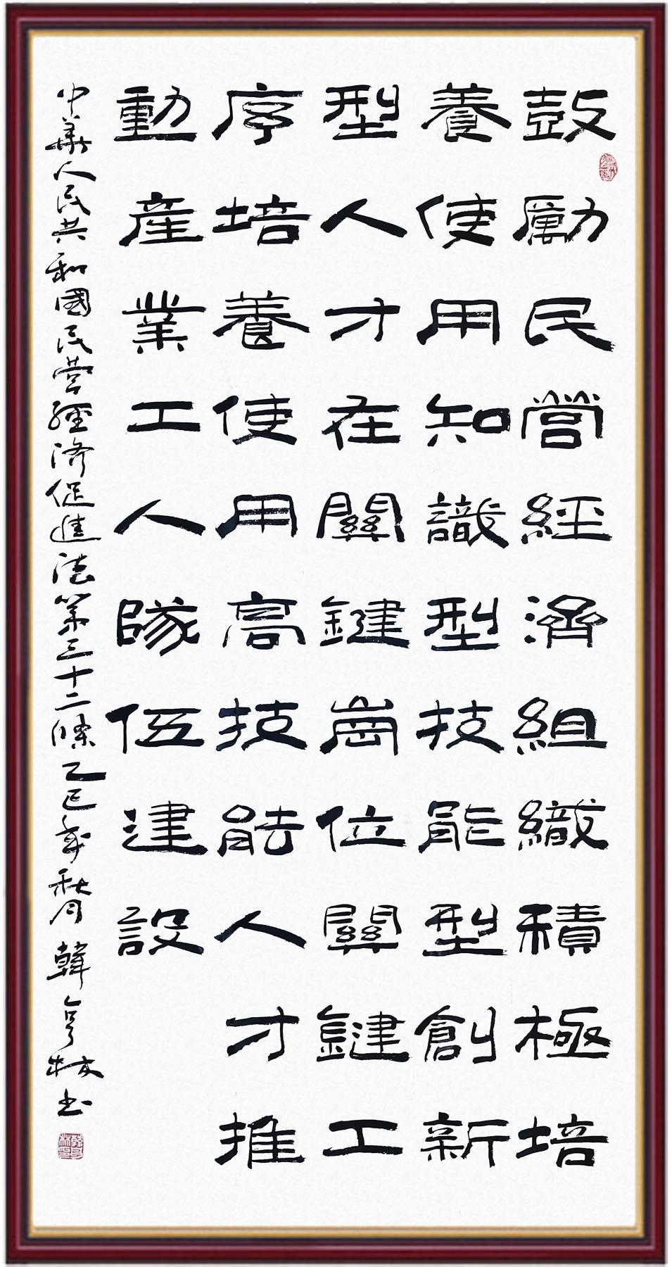 《中華人民共和國民營經(jīng)濟促進法》自今年5月20日起施行。作為我國首部專門關于民營經(jīng)濟發(fā)展的基礎性法律,民營經(jīng)濟促進法將支持和保障民營經(jīng)濟發(fā)展的法律制度融入中國特色社會主義法律體系,具有重大的法治意義,為促進民營經(jīng)濟持續(xù)、健康、高質(zhì)量發(fā)展提供了堅實的法治保障。為更好地學習、宣傳、貫徹這部法律,法治日報社聯(lián)合司法部普法與依法治理局,開展“‘書·法’系列活動之書寫《中華人民共和國民營經(jīng)濟促進法》”活動。