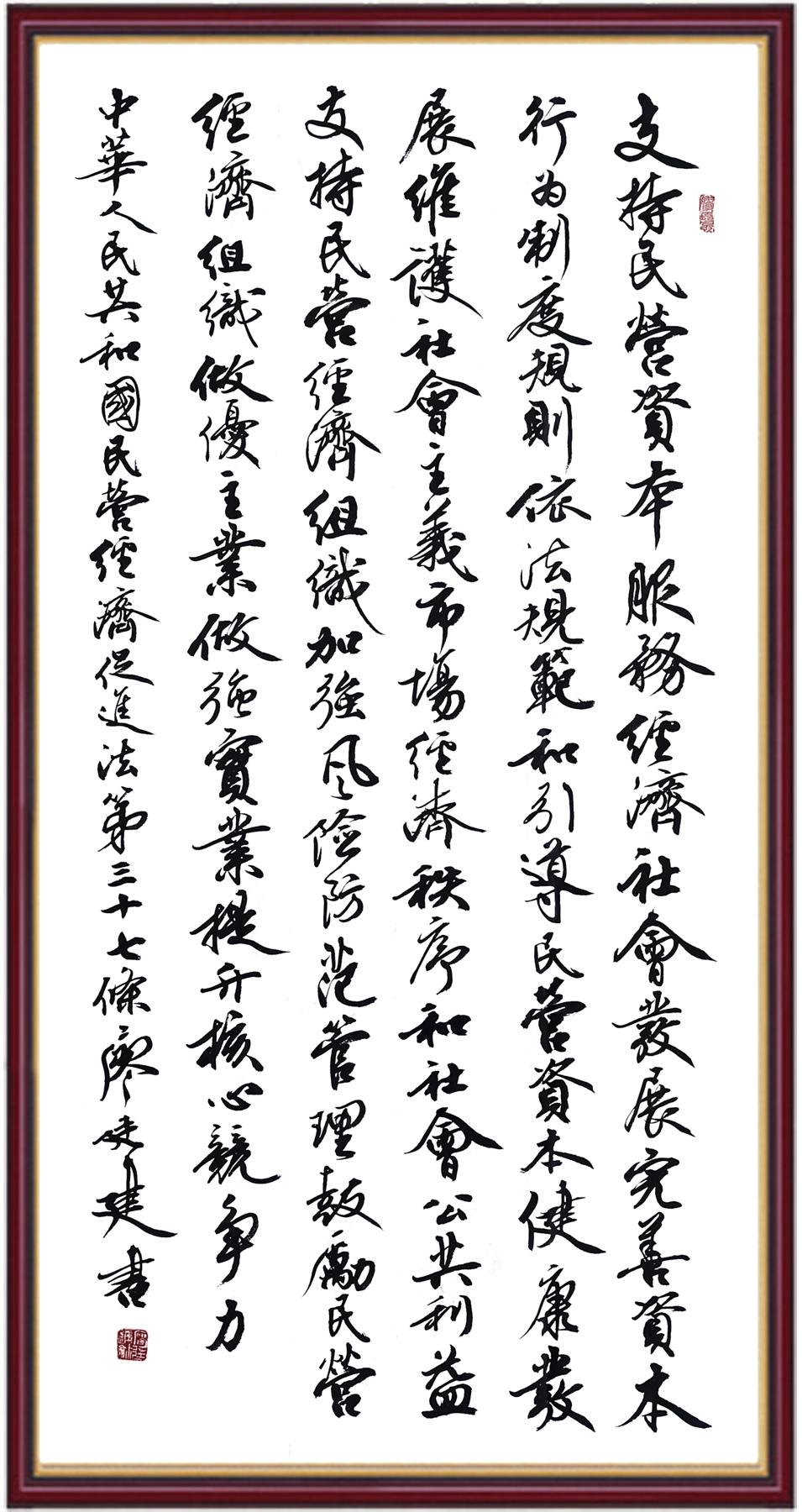 《中華人民共和國(guó)民營(yíng)經(jīng)濟(jì)促進(jìn)法》自今年5月20日起施行。作為我國(guó)首部專門關(guān)于民營(yíng)經(jīng)濟(jì)發(fā)展的基礎(chǔ)性法律,民營(yíng)經(jīng)濟(jì)促進(jìn)法將支持和保障民營(yíng)經(jīng)濟(jì)發(fā)展的法律制度融入中國(guó)特色社會(huì)主義法律體系,具有重大的法治意義,為促進(jìn)民營(yíng)經(jīng)濟(jì)持續(xù)、健康、高質(zhì)量發(fā)展提供了堅(jiān)實(shí)的法治保障。為更好地學(xué)習(xí)、宣傳、貫徹這部法律,法治日?qǐng)?bào)社聯(lián)合司法部普法與依法治理局,開展“‘書·法’系列活動(dòng)之書寫《中華人民共和國(guó)民營(yíng)經(jīng)濟(jì)促進(jìn)法》”活動(dòng)。