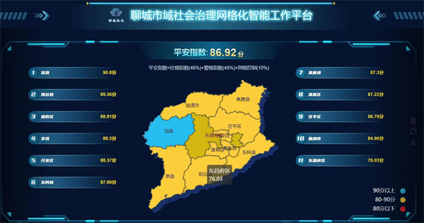 試點(diǎn)工作中,聊城市運(yùn)用市域社會治理智能化平臺助力深化平安建設(shè),在平臺定期生成全市“平安指數(shù)”,涵蓋各縣區(qū)社會治安、道路交通、安全生產(chǎn)等10項(xiàng)指標(biāo),引導(dǎo)精準(zhǔn)查找、整改短板問題。針對重大活動,發(fā)揮平臺研判決策、指揮調(diào)度功能,對問題及時發(fā)現(xiàn)處置,助力工作嚴(yán)格落實(shí)。