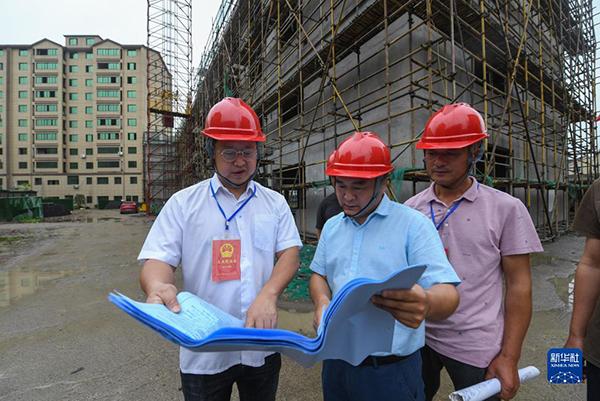 在浙江省湖州市吳興區(qū)東林鎮(zhèn)星火村,當(dāng)?shù)厝舜蟠砑按迕翊韺π腔鸫遛r(nóng)民新村建設(shè)項目的施工進(jìn)展情況進(jìn)行監(jiān)督檢查(2021年6月2日攝)。新華社記者 徐昱 攝