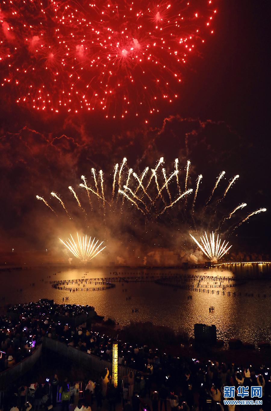 1月31日晚,煙花光影水秀在天河潭景區(qū)上演。新華網 盧志佳 攝