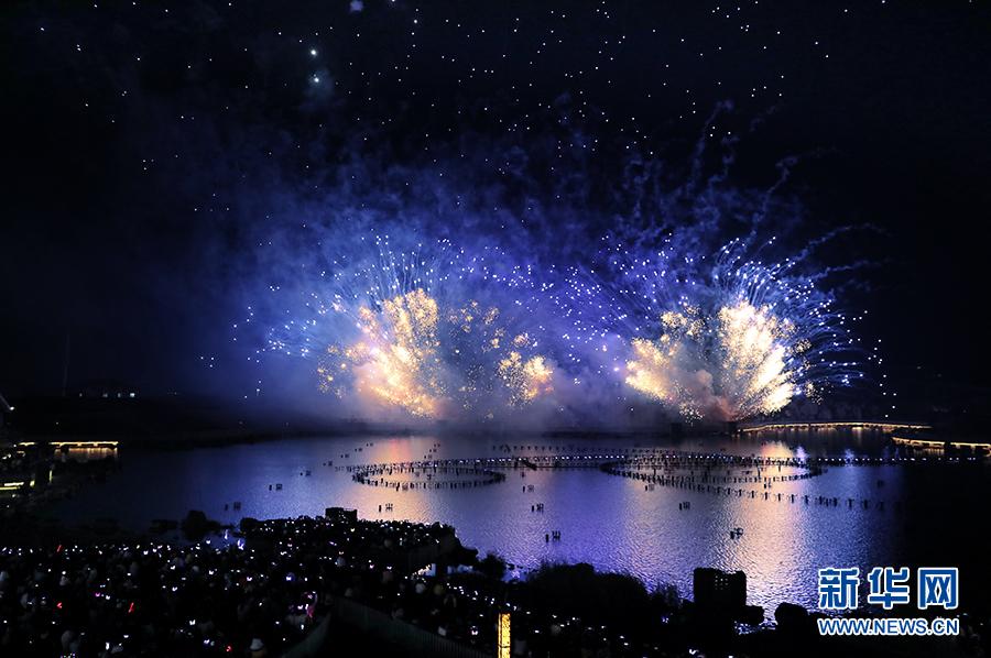 1月31日晚,煙花光影水秀在天河潭景區(qū)上演。新華網(wǎng) 盧志佳 攝