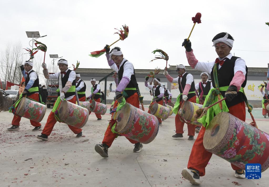 2月1日,鄉(xiāng)村秧歌隊(duì)在甘肅省臨夏回族自治州積石山保安族東鄉(xiāng)族撒拉族自治縣表演秧歌節(jié)目“太平鼓”。新華社發(fā)(史有東 攝)