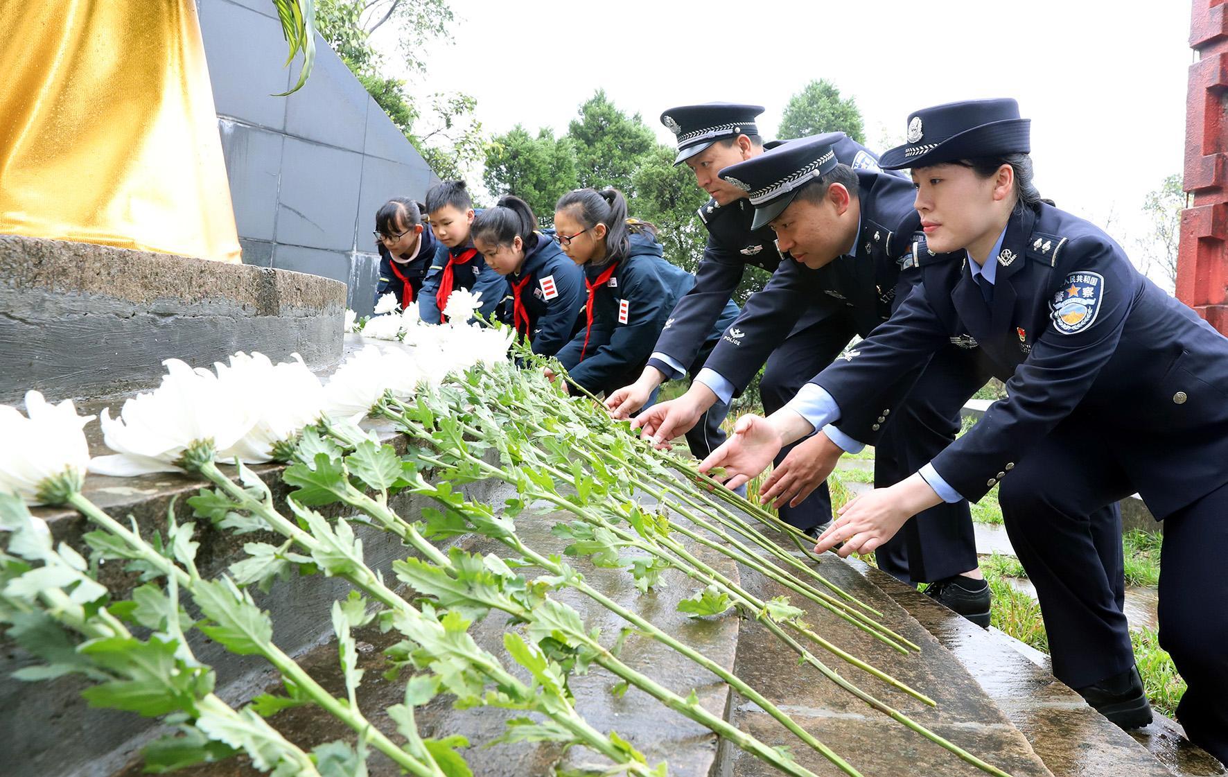 3月30日,浙江省臺州市公安局路橋分局橫街派出所民警和少年兒童一起為抗日戰(zhàn)爭犧牲的陳安寶烈士敬獻(xiàn)鮮花,以表深切緬懷之情。