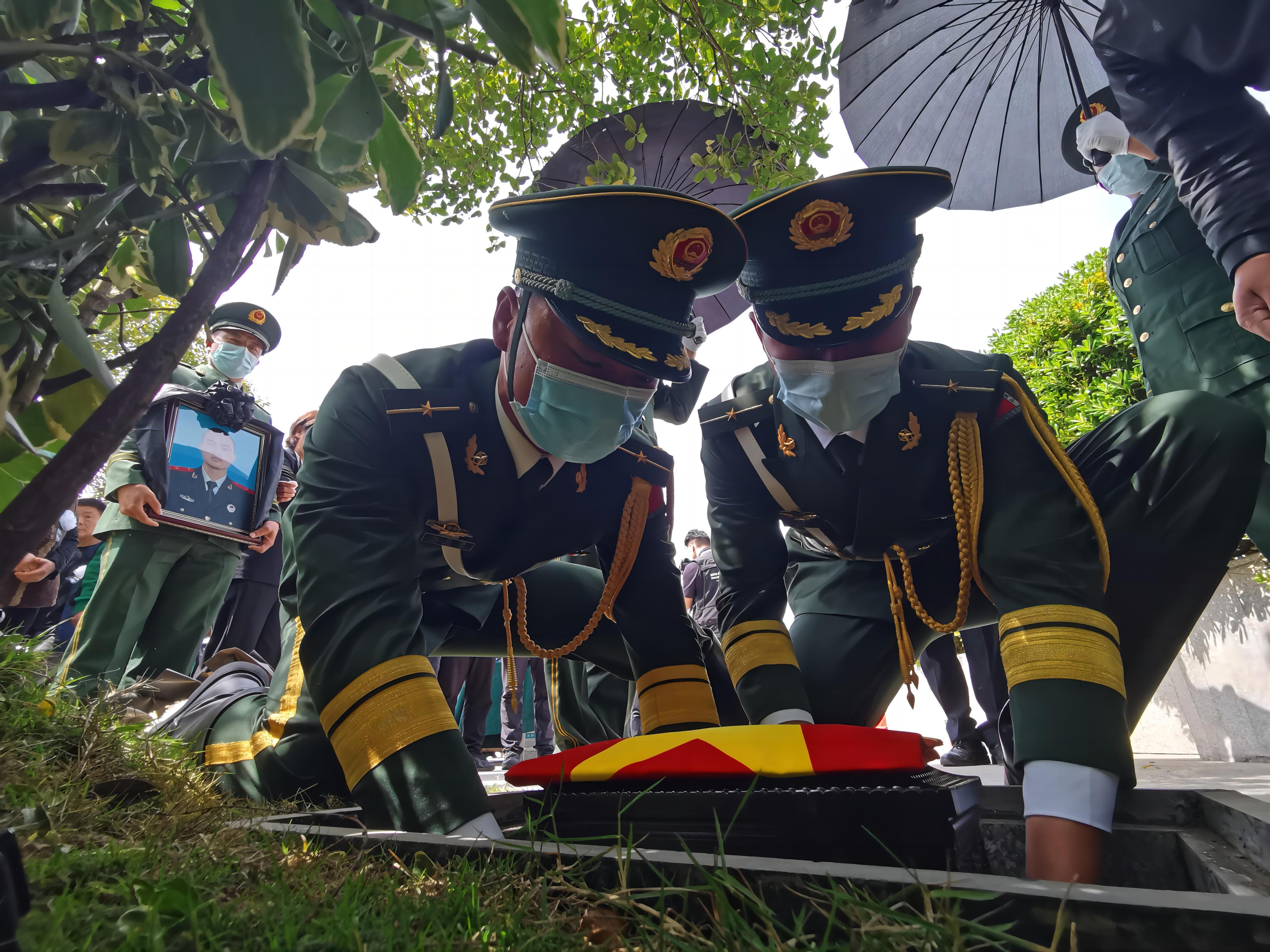 4月10日上午,多云,安徽省阜陽市太和縣萬壽山烈士紀(jì)念碑廣場莊嚴(yán)肅穆,汪曉龍烈士骨灰安葬儀式在這里舉行。在凄美壯麗的《思念曲》中,一名禮兵手捧烈士遺像,另一名禮兵手捧覆蓋著國旗的烈士骨灰盒,緩緩步入廣場,放置在悼念臺上,兩側(cè)的挽聯(lián)寫著“此去忠魂化碧濤 精神永留天地間”?,F(xiàn)場奏國歌,宣讀汪曉龍?jiān)u定烈士批復(fù)和簡要事跡,致悼詞默哀,烈士骨灰入土安葬。中國海警局南海分局、阜陽市太和縣相關(guān)領(lǐng)導(dǎo)和社會各界干部群眾近300人送別烈士。