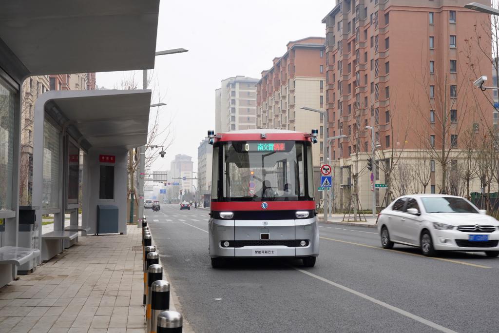 智能網(wǎng)聯(lián)巴士在雄安新區(qū)容東片區(qū)道路上行駛。新華社記者牟宇 攝