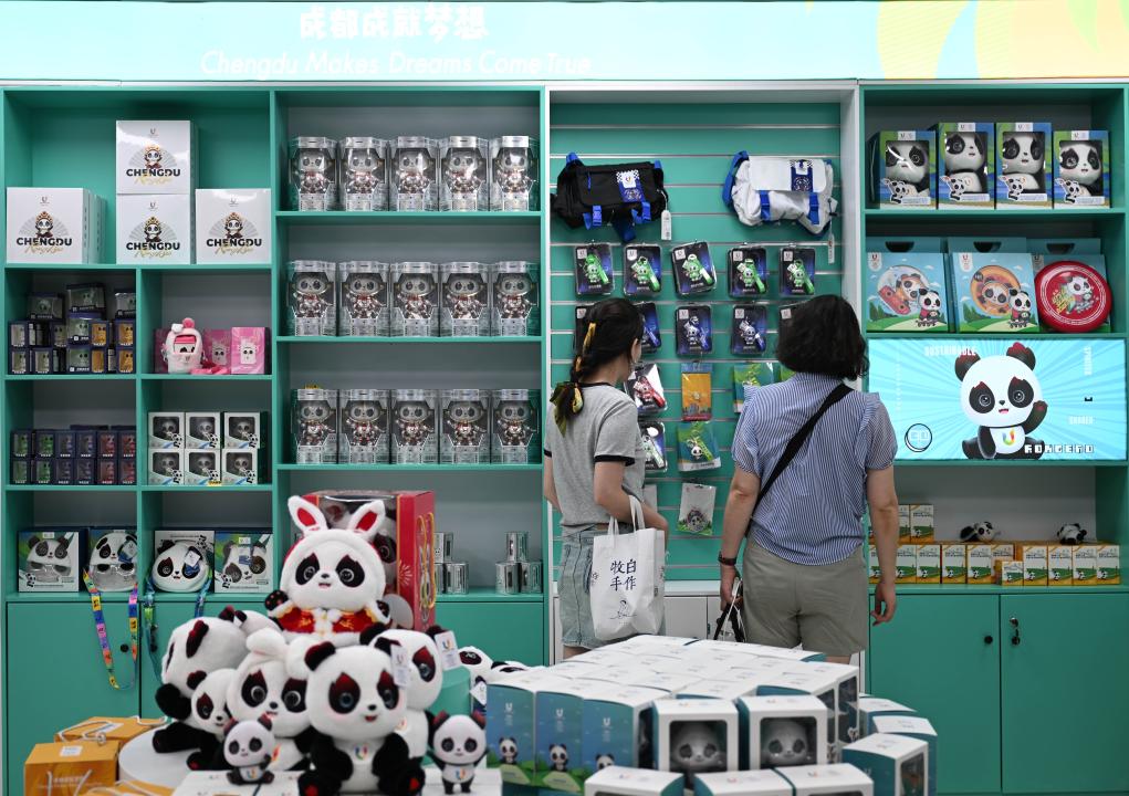 ↑7月18日,市民在成都大運(yùn)會(huì)成都博物館官方特許商品零售店內(nèi)選購(gòu)“蓉寶”公仔。