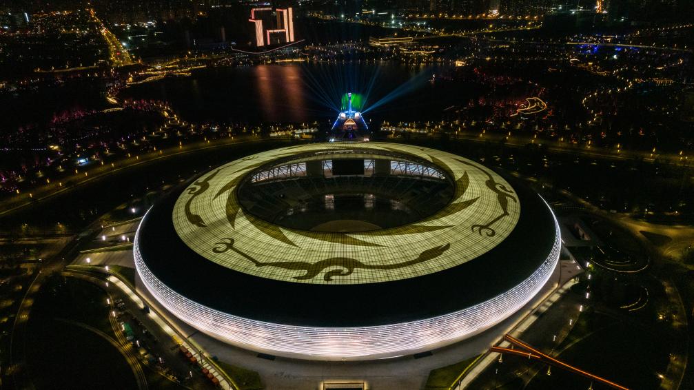 ↑這是4月19日拍攝的第31屆世界大學(xué)生夏季運(yùn)動(dòng)會(huì)開(kāi)幕式主體育場(chǎng)及主火炬(無(wú)人機(jī)照片)