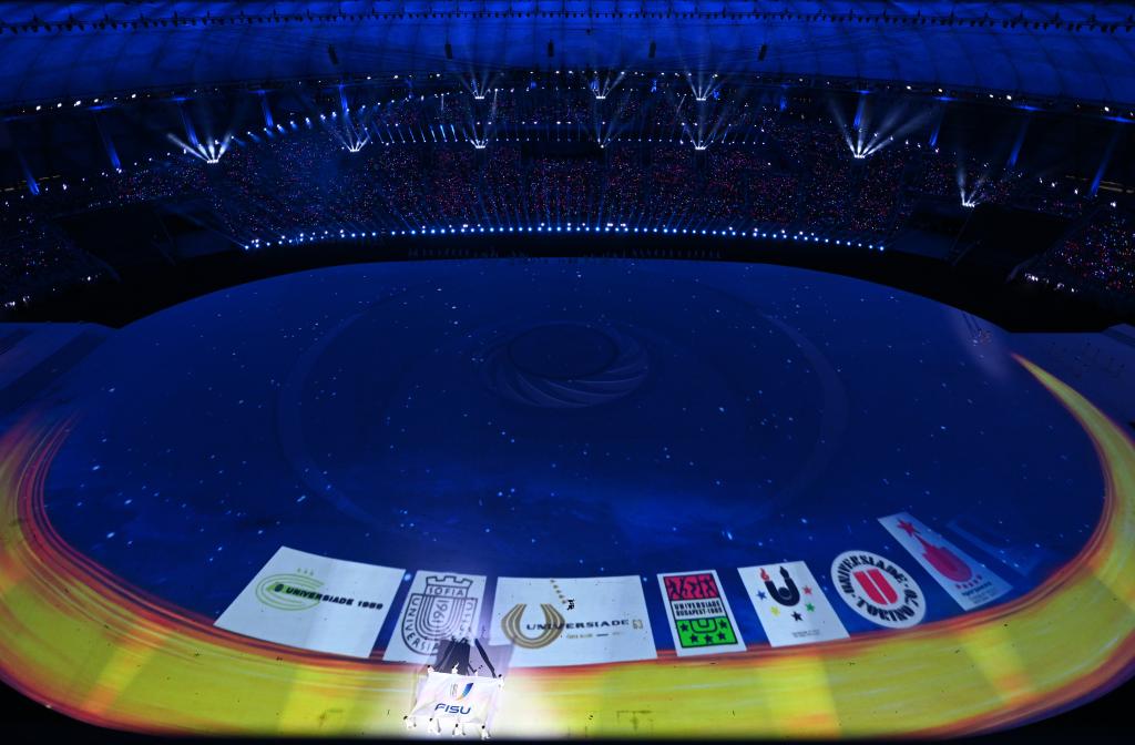 7月28日,國際大學(xué)生體育聯(lián)合會會旗在開幕式上升起。新華社記者胥冰潔攝