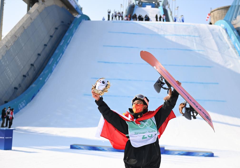 2022年2月15日,中國選手蘇翊鳴在頒發(fā)紀(jì)念品儀式后。當(dāng)日,北京2022年冬奧會單板滑雪男子大跳臺決賽在北京首鋼滑雪大跳臺舉行。中國選手蘇翊鳴奪得金牌。新華社記者黃宗治攝