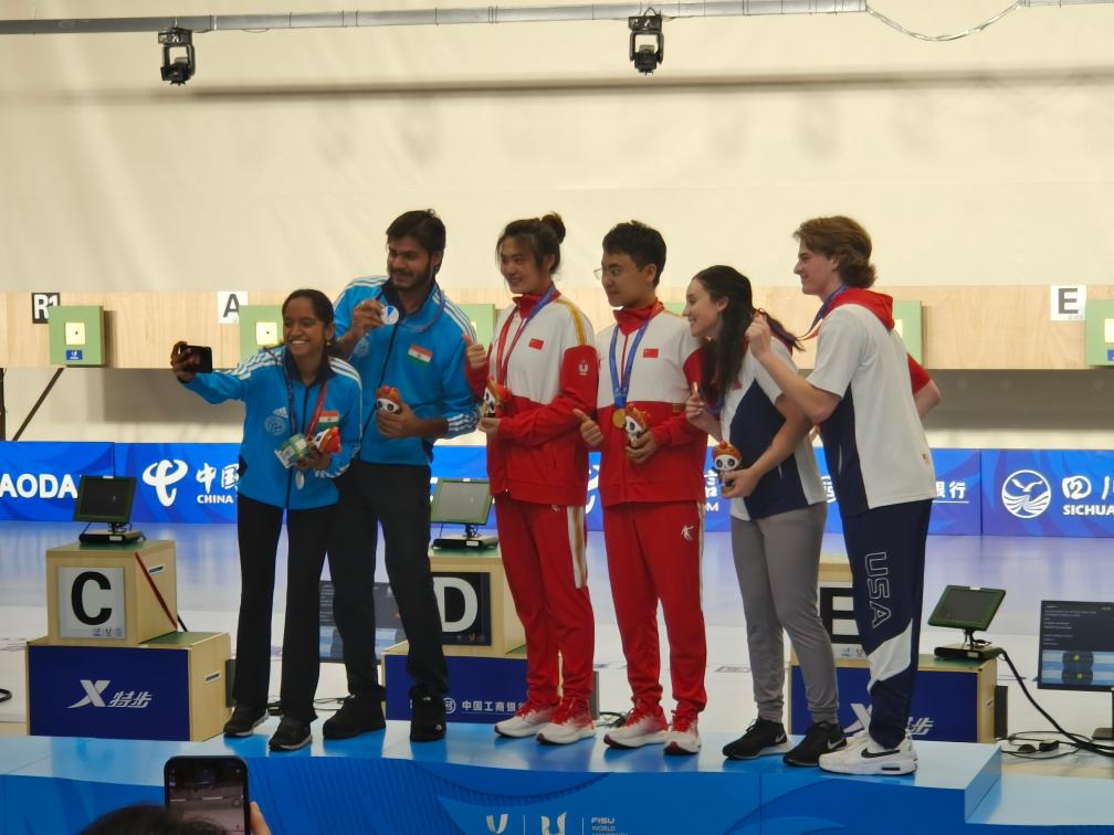 當(dāng)天,射擊賽場的頒獎(jiǎng)儀式現(xiàn)場變成了全場一起慶生的歡樂景象。在10米氣步槍混合團(tuán)體項(xiàng)目獲得銀牌的印度姑娘瓦拉里萬站在領(lǐng)獎(jiǎng)臺上,在“生日快樂”的祝福聲中,伴著現(xiàn)場觀眾的掌聲,與一同參加頒獎(jiǎng)儀式的中國、美國選手們拍照留念。