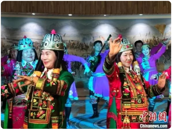 在博湖縣蒙古族非遺傳承保護(hù)中心,民間藝人們身穿華麗的民族服飾,伴隨著歡快的音樂(lè),抖肩、彎腰、翻掌,表演薩吾爾登舞蹈,惟妙惟肖的舞姿、歡快強(qiáng)勁的節(jié)奏,為現(xiàn)場(chǎng)觀眾帶來(lái)了一場(chǎng)精彩絕倫的視覺(jué)盛宴。