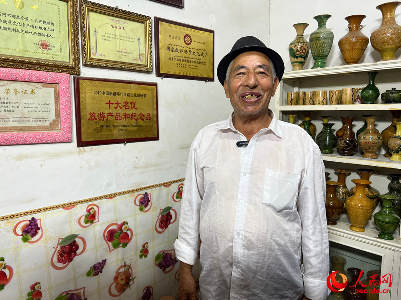 國家級非物質(zhì)文化遺產(chǎn)模制法土陶燒制技藝傳承人阿卜杜熱合曼·麥麥提敏為記者介紹他獲得的榮譽(yù)。人民網(wǎng)記者 常雪梅攝