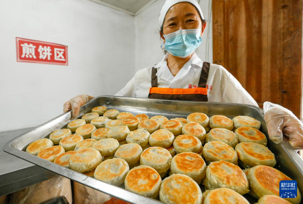 9月19日,在安徽省黃山市徽州區(qū)澄塘村一家月餅作坊,工人展示剛剛烘烤出的火腿土月餅。