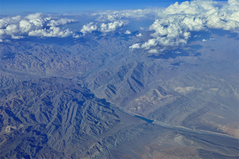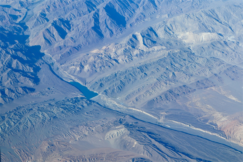 從飛機上拍攝的位于新疆博格達山南麓的吐魯番市大河沿河及大河沿水庫。(中國日報記者朱立新 攝)