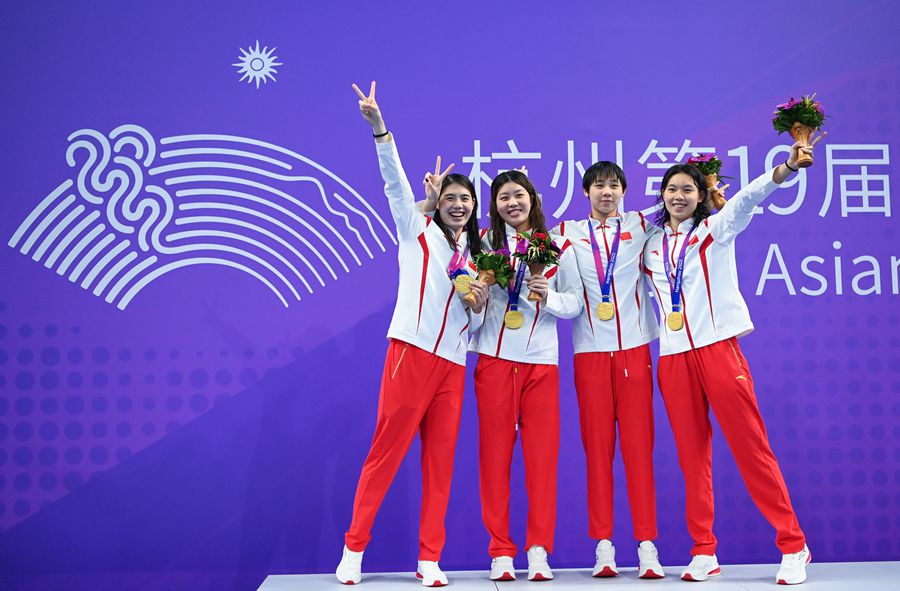 9月24日,女子4x100米自由泳接力決賽,由楊浚瑄、程玉潔、吳卿風(fēng)和張雨霏組成的中國(guó)隊(duì)優(yōu)勢(shì)明顯,最終以3分33秒96破賽會(huì)紀(jì)錄的成績(jī)奪得冠軍。