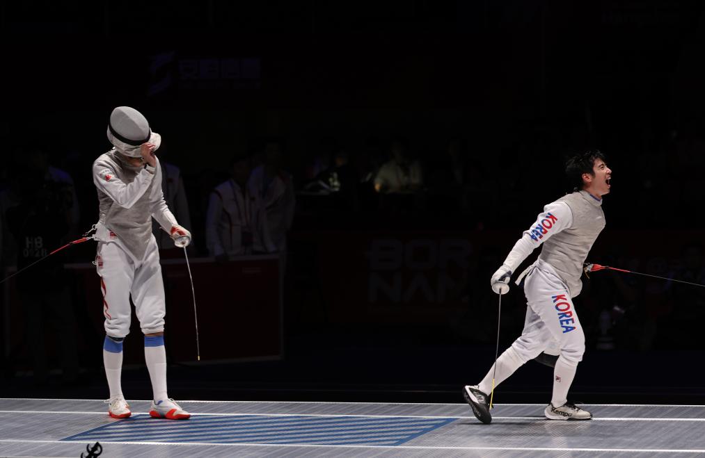 中國男子花劍隊當(dāng)日有驚喜有遺憾。團體半決賽面對世界排名第一、今年世錦賽和亞錦賽上均摘得金牌的日本隊,中國隊以45:44逆轉(zhuǎn)險勝對手,但在決賽中以38:45不敵衛(wèi)冕冠軍韓國隊。中國隊陳海威賽后說:“決賽我們都付出了所有,但還是比較遺憾?!?/p>