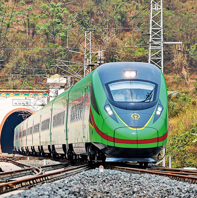 “復(fù)興號”動車組從中老鐵路友誼隧道穿行而出。