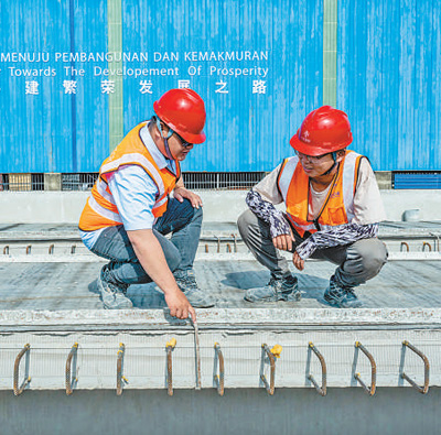馬來西亞吉蘭丹州的馬東鐵項目一分部制梁場,技術(shù)人員討論生產(chǎn)情況。