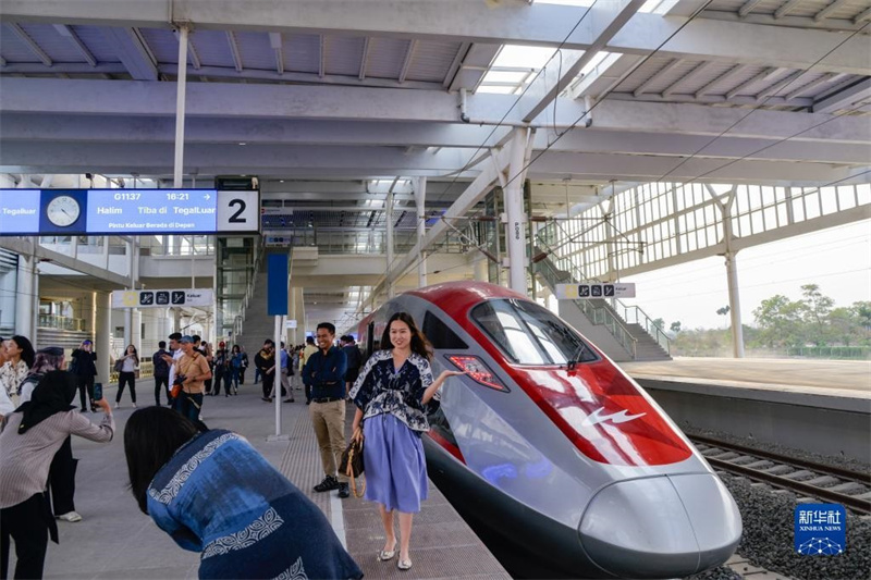 10月17日,在印度尼西亞萬(wàn)隆德卡魯爾站,乘客在站臺(tái)上和雅萬(wàn)高鐵高速動(dòng)車組列車合影。新華社記者 徐欽 攝