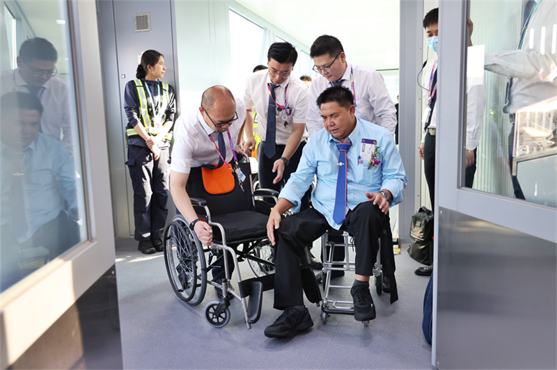 “一共219名代表團成員,其中78名輪椅旅客,下客艙后的轉換輪椅均已準備到位?!?4時50分,泰國代表團成員搭乘TG8062包機航班落地,工作人員早已提前備好轉換輪椅在艙門口等候。